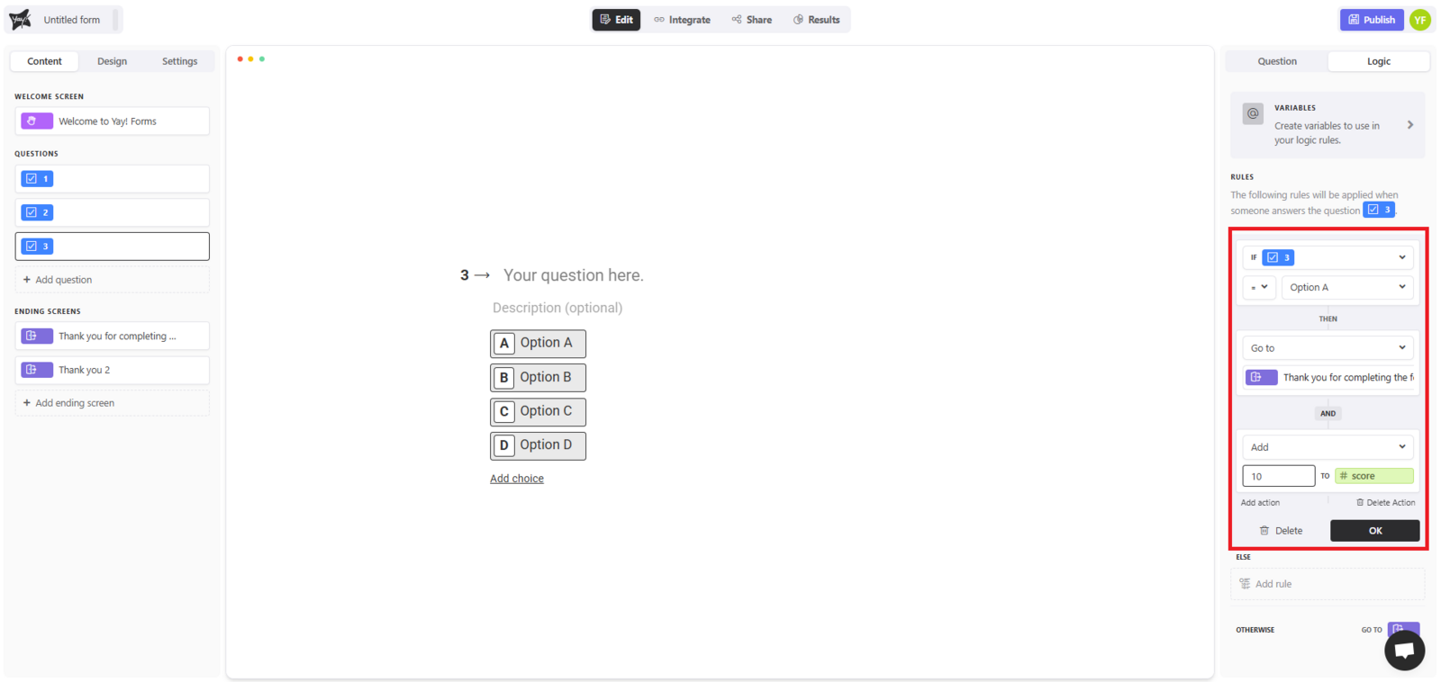 - IF (your question) = Option A → go to end screen and add 10 points to the variable