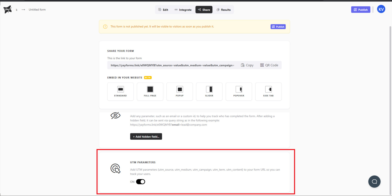 Now, simply scroll down and enable the UTM Parameters option. After that, you will notice the UTM parameters in your form URL.