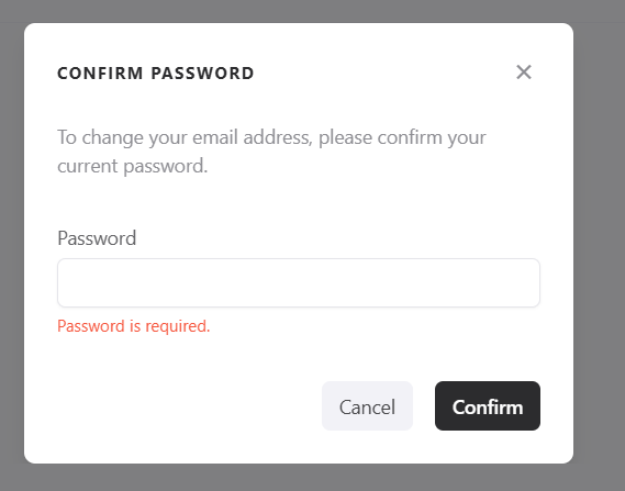 When you change the email, a modal will appear asking for your current password to validate the action. Enter the correct password and click Confirm.