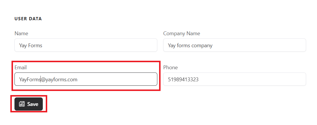 After accessing the profile page, scroll down until you find the User Data section. In this section, you can edit your personal information, such as your name, company name, email, and phone number.
