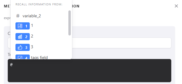 Represented by @, they identify specific data. Examples include @campo1, @hiddenfiled, @utm_source, and @variable_name. In this case, you only need to type @ and the list of fields, hidden fields, UTM parameters, and variables will appear, as shown in the image below:
