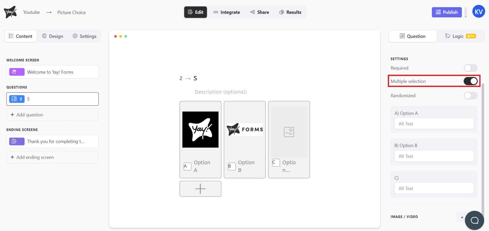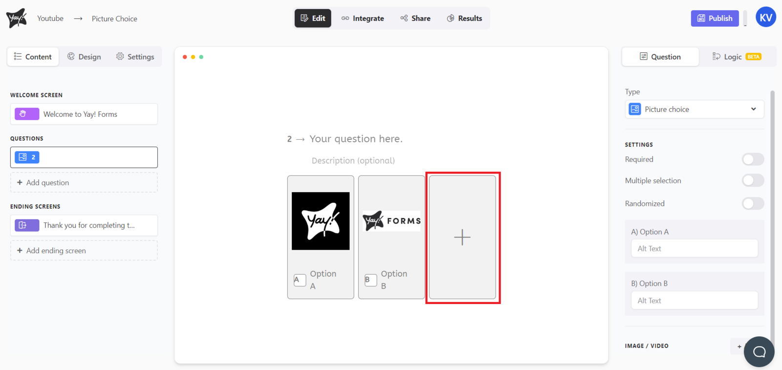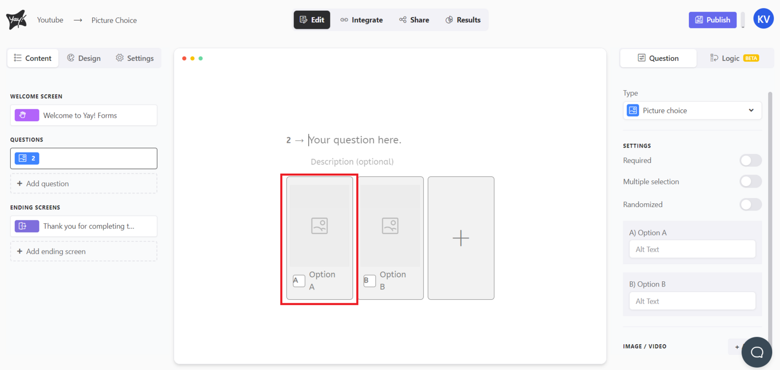 This article explains how to create an image choice question, where users can select an answer from a list of options that include attached images. It also covers how to add or select option images, create additional choices, adjust settings like multiple selection and randomized ordering, and customize image alt text.