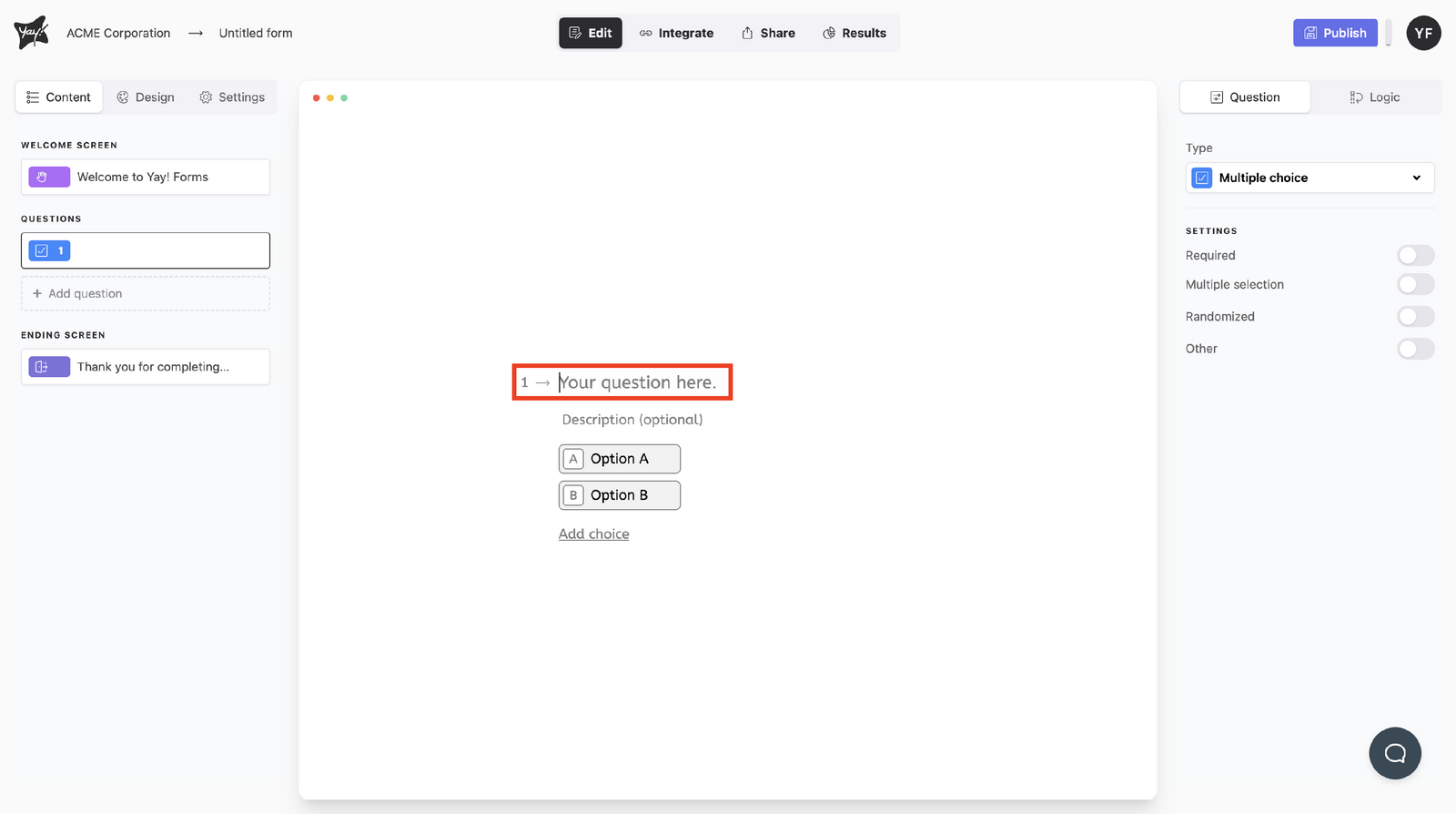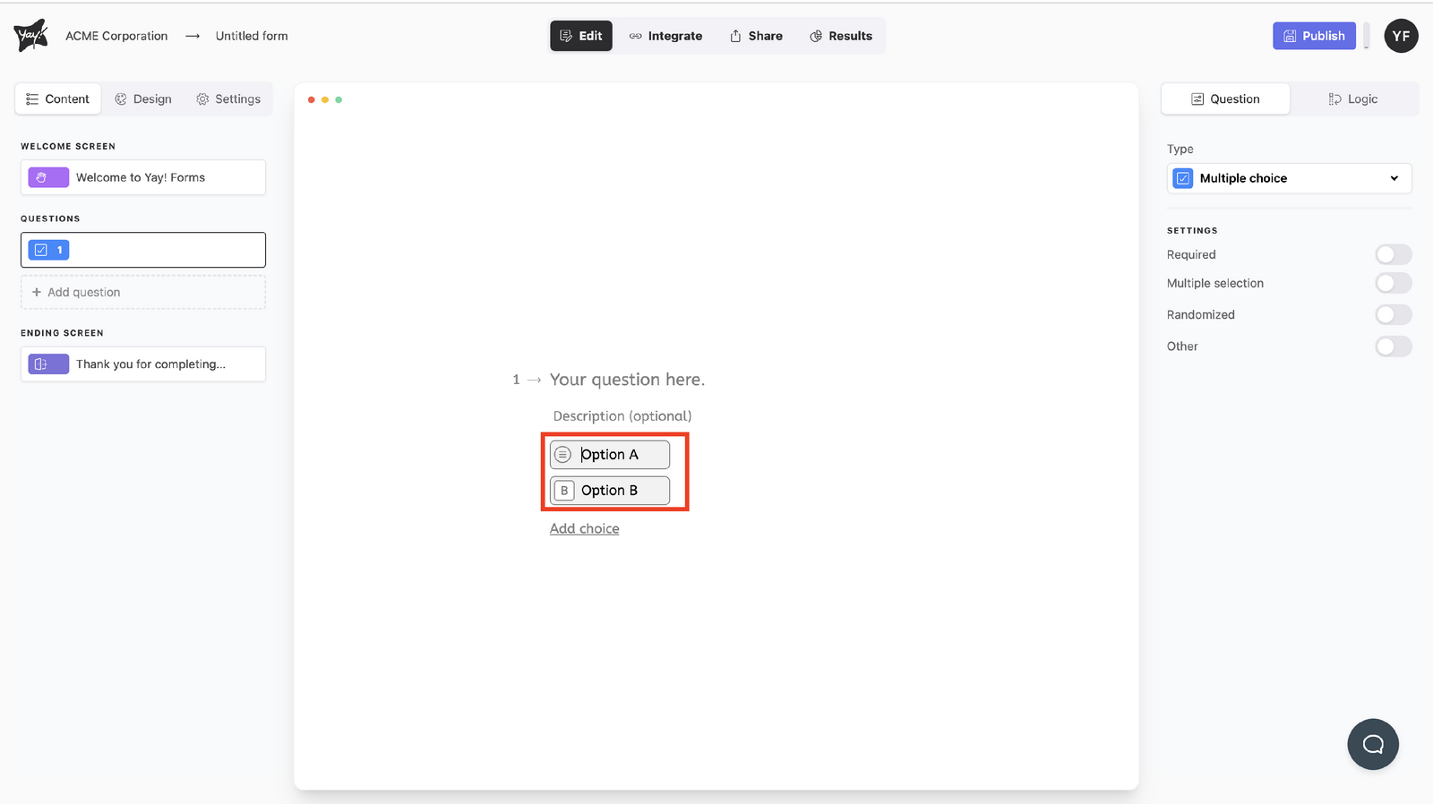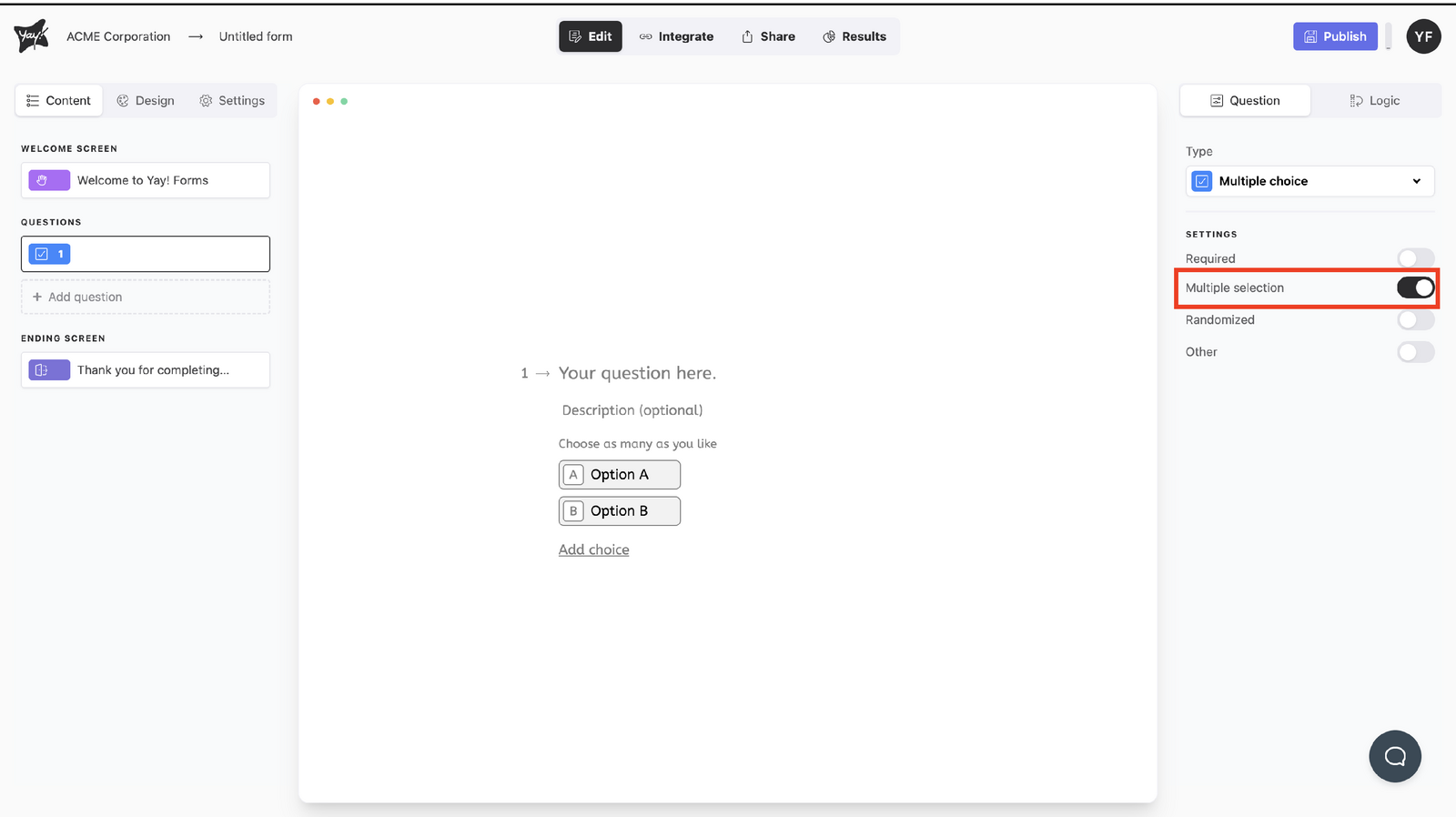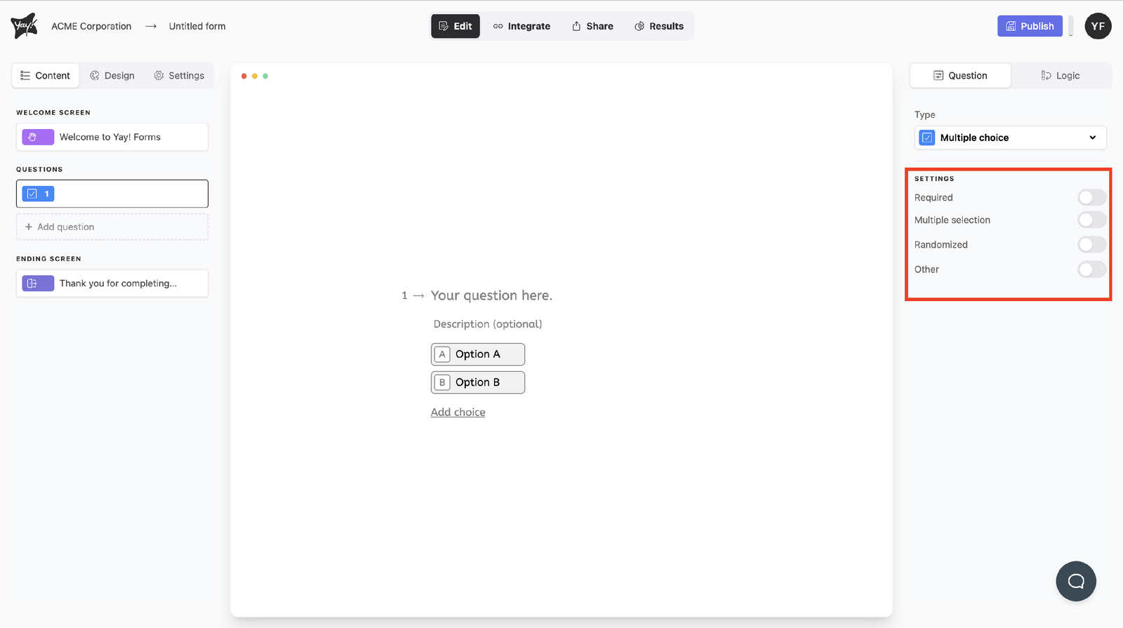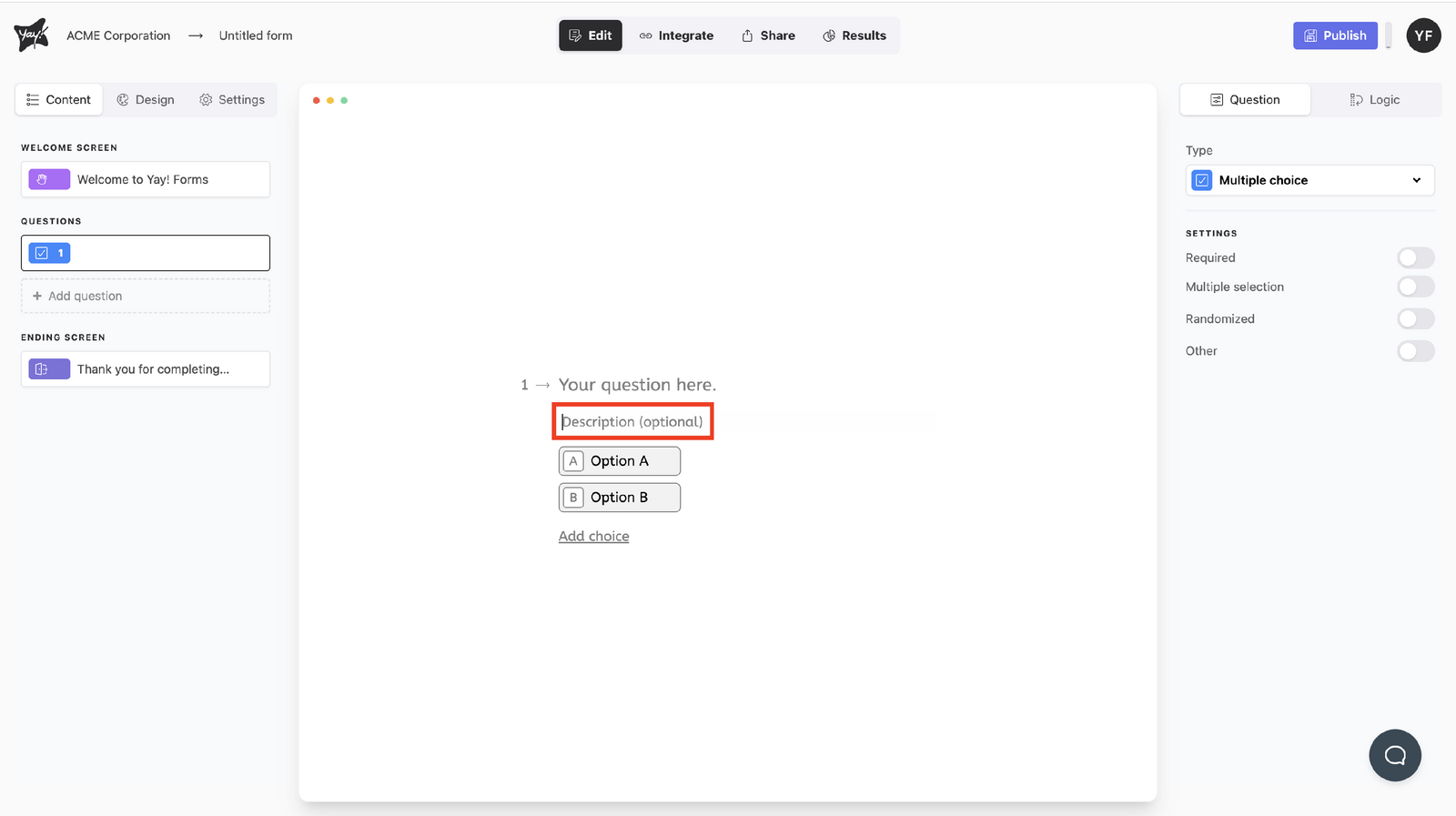 This article explains how to create and configure a multiple choice question, including how to edit the question text, add an optional description, manage answer choices, and adjust settings such as allowing multiple selections, randomizing choices, and adding an “Other” option.