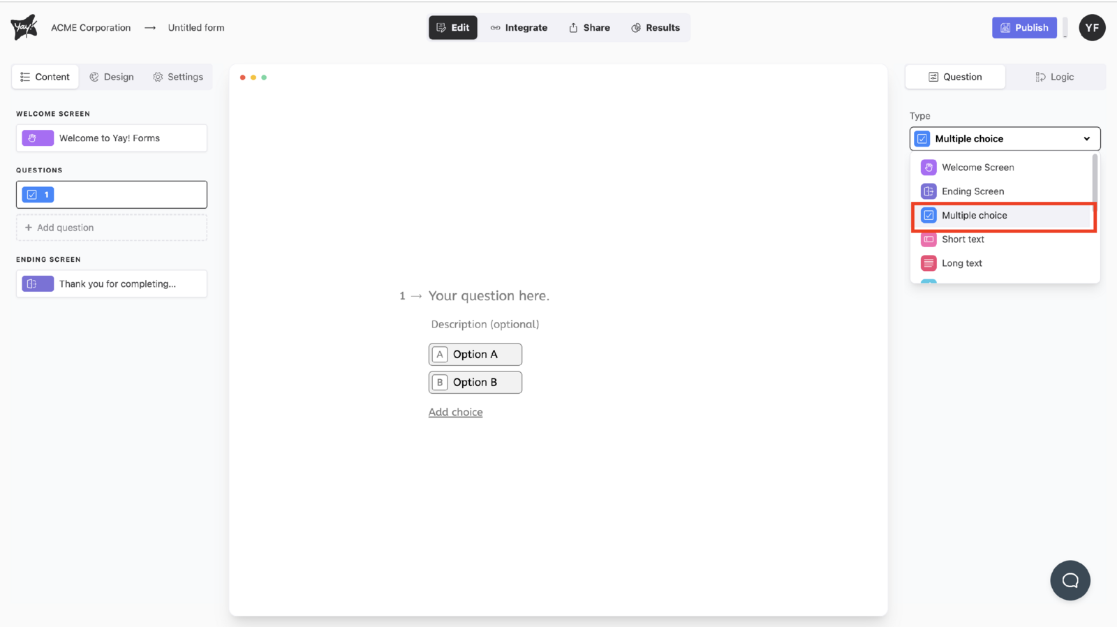 Choose this question type by selecting Multiple choice from the dropdown menu under Type in the upper-right corner of the screen.