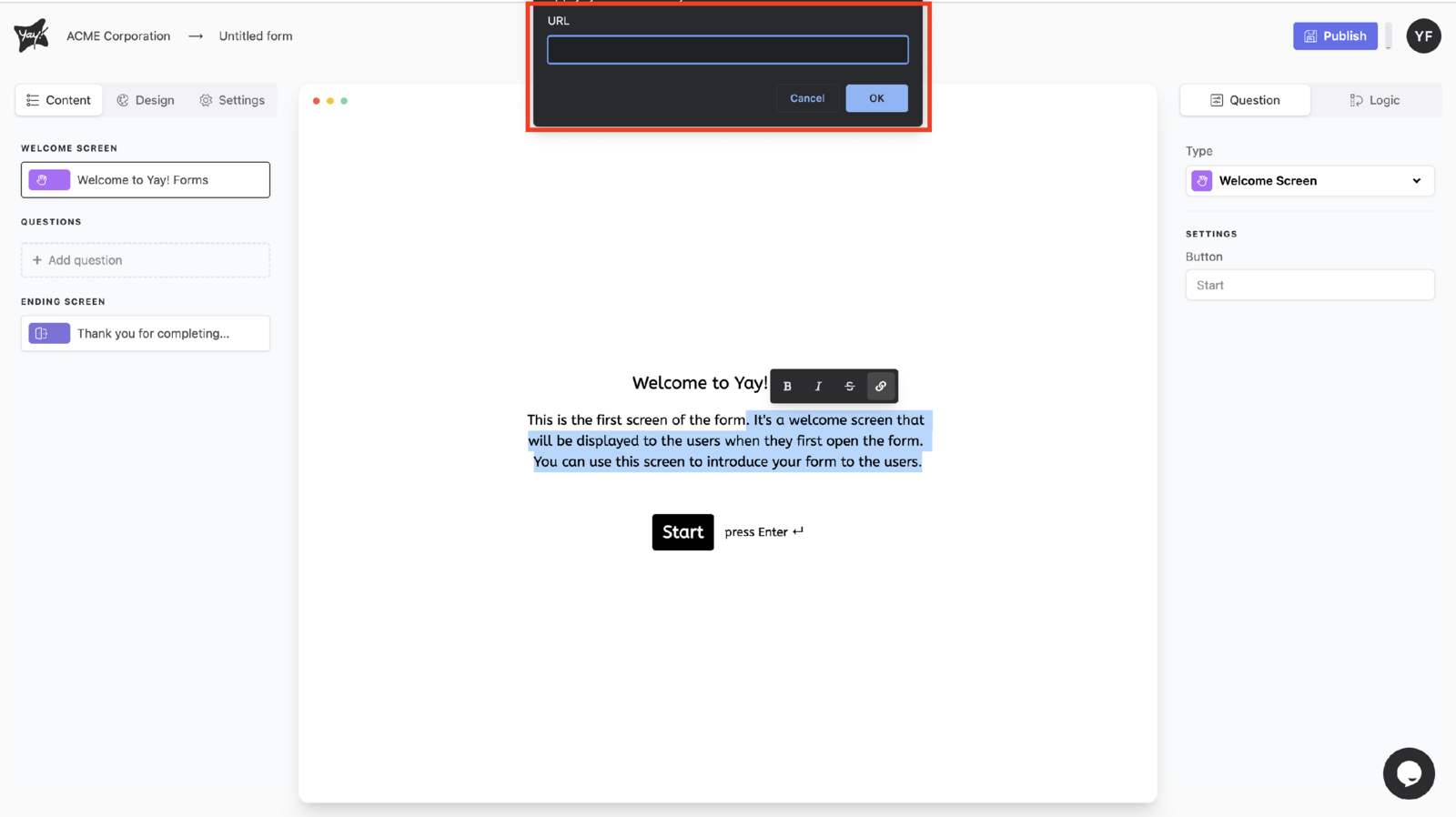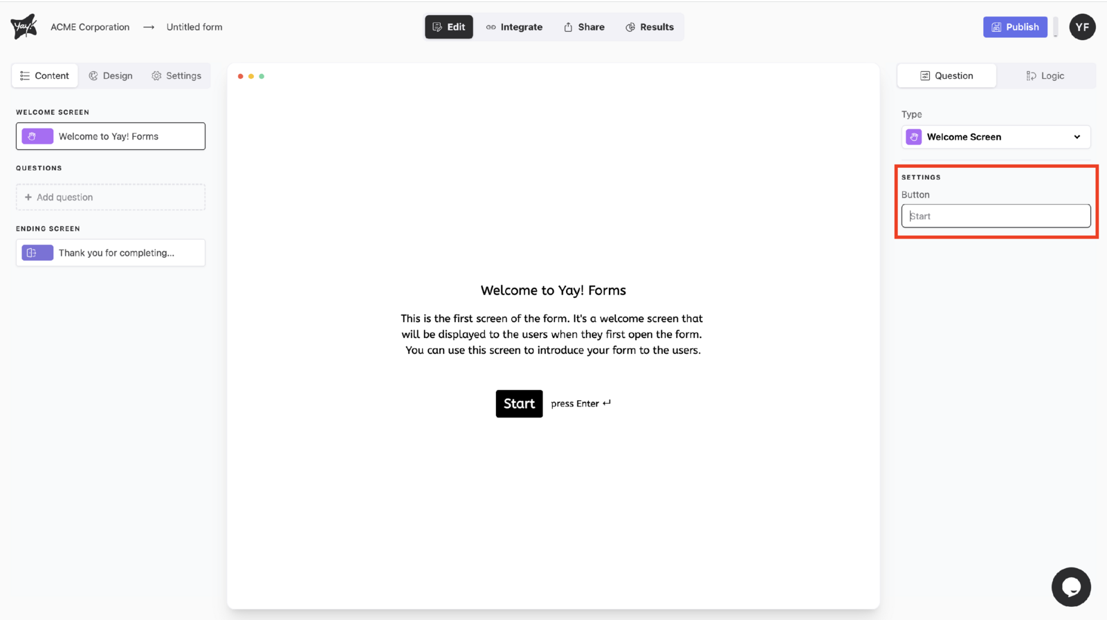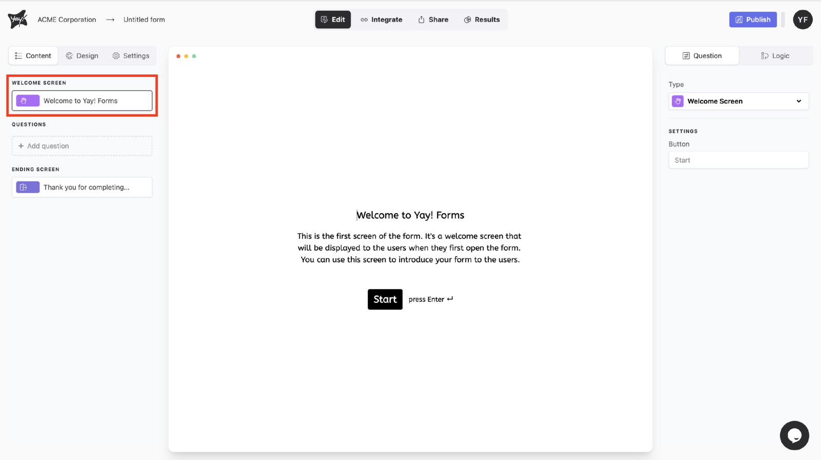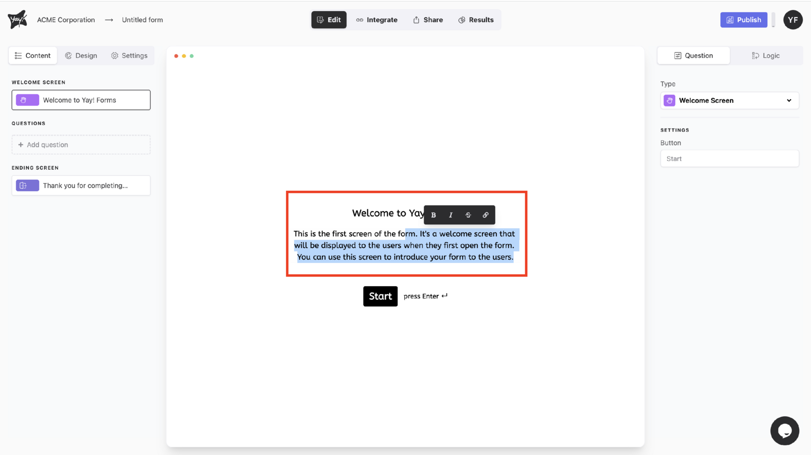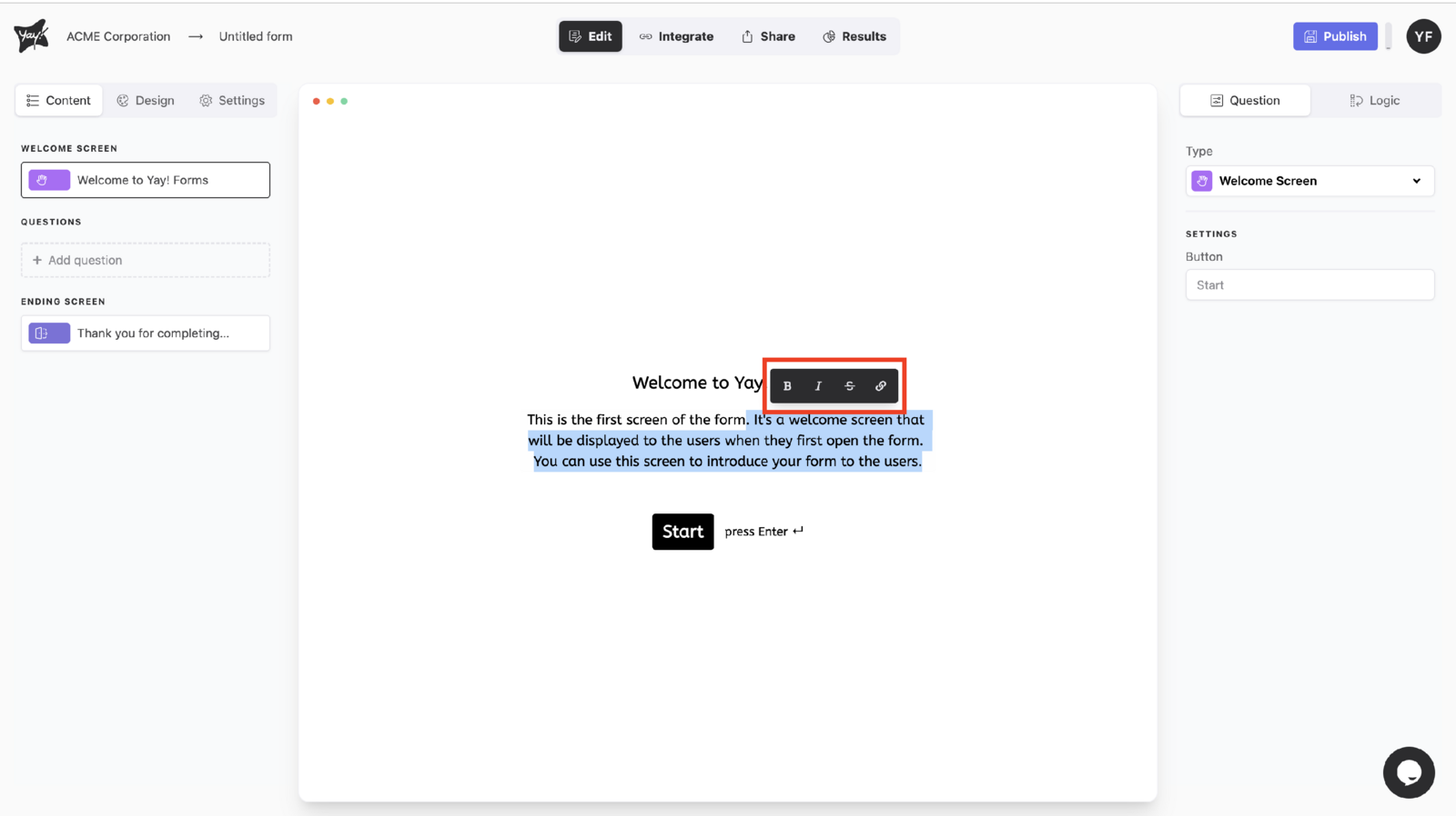 This article will help you customize your form’s welcome screen, including changing the Start button text, editing the title and description, formatting text, and adding links. It also explains what to do when you want to discard changes or publish your form.