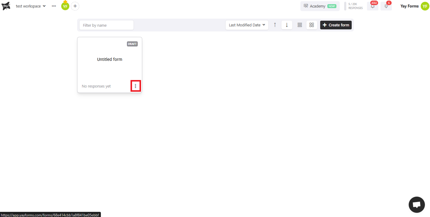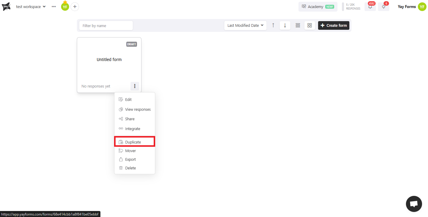 This article will help you duplicate a form in Yay forms by locating the form inside the correct workspace and using the form menu to create a copy.