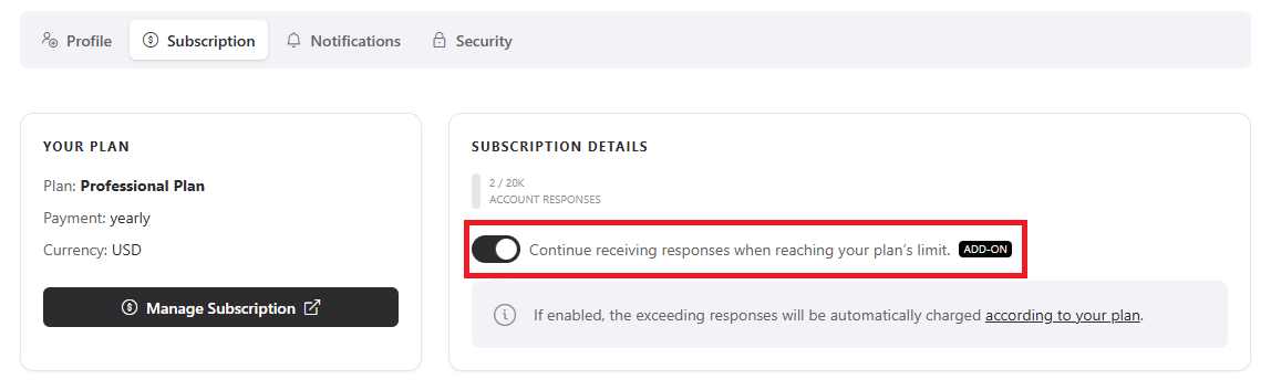 As shown in the image, keep in mind that this option is used to continue receiving responses after your plan reaches the response limit. Any overage responses will be charged automatically according to your plan.