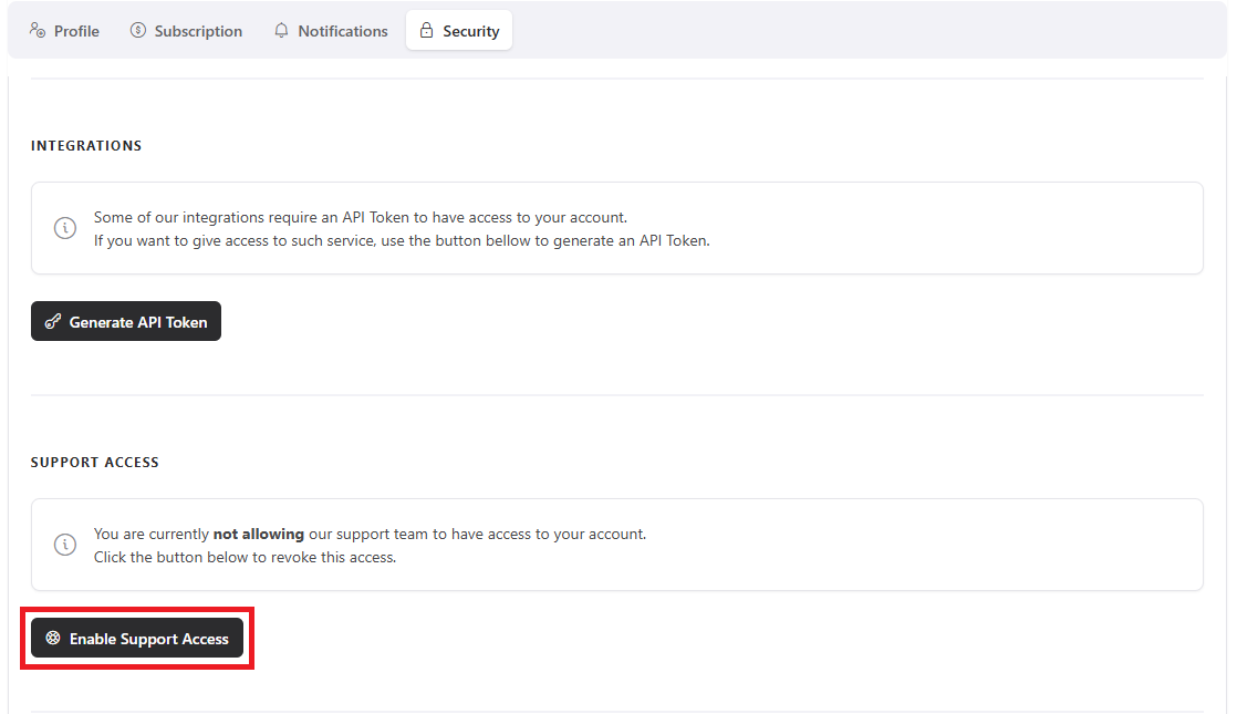 After accessing the profile page, navigate to the Security page. Then you will need to click the Enable support access option.
