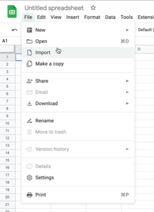 To add them to Google Sheets, go to the desired spreadsheet, click 'File', and then click 'Import'.