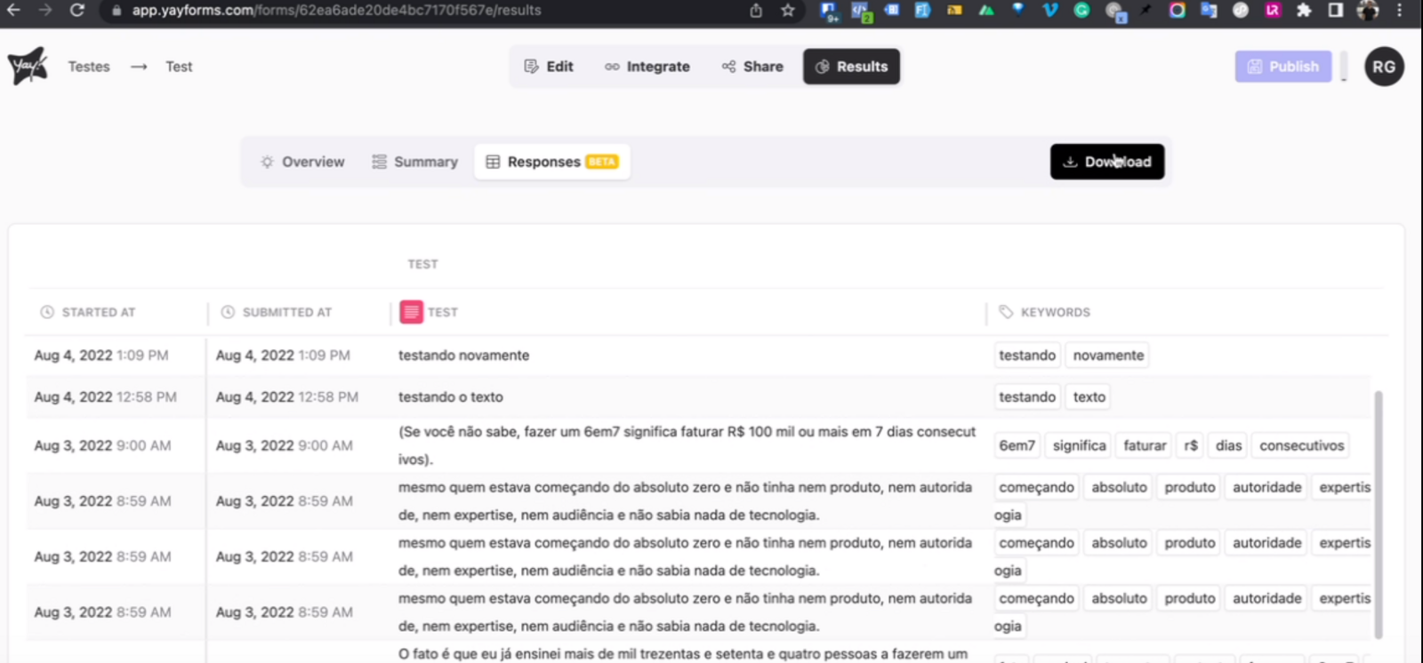 To import your form into Excel, click 'Results' at the top of the screen. Then click 'Responses' and click 'download' to download your responses.