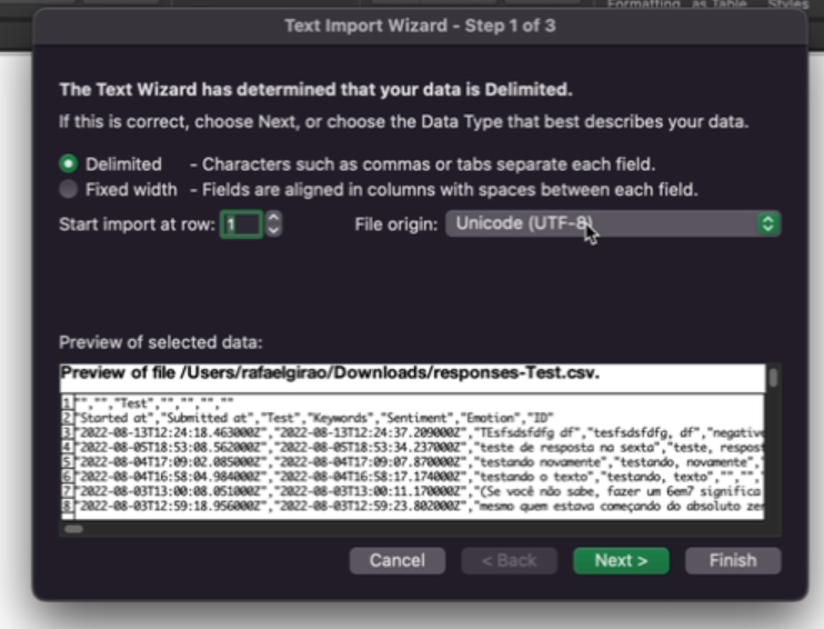 Right after that, a window will open asking how you would like to import your data. Our suggestion is to choose the delimited option and separate them by comma.
