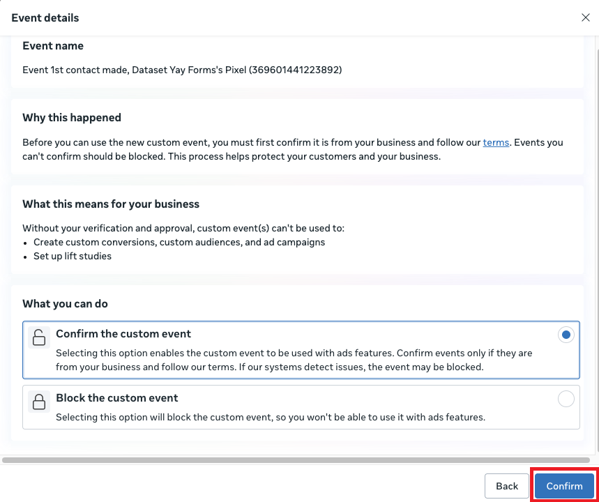 If assets (custom events and subdomains) are not shared correctly with the ad account, the events may not be usable in campaigns.