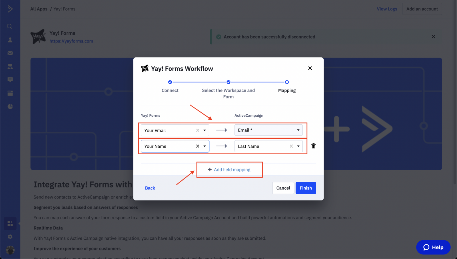 Map the fields between Yay! Forms (left) and ActiveCampaign (right), as shown in the image below. You can add as many fields as you want. After completing the mapping, click Finish.