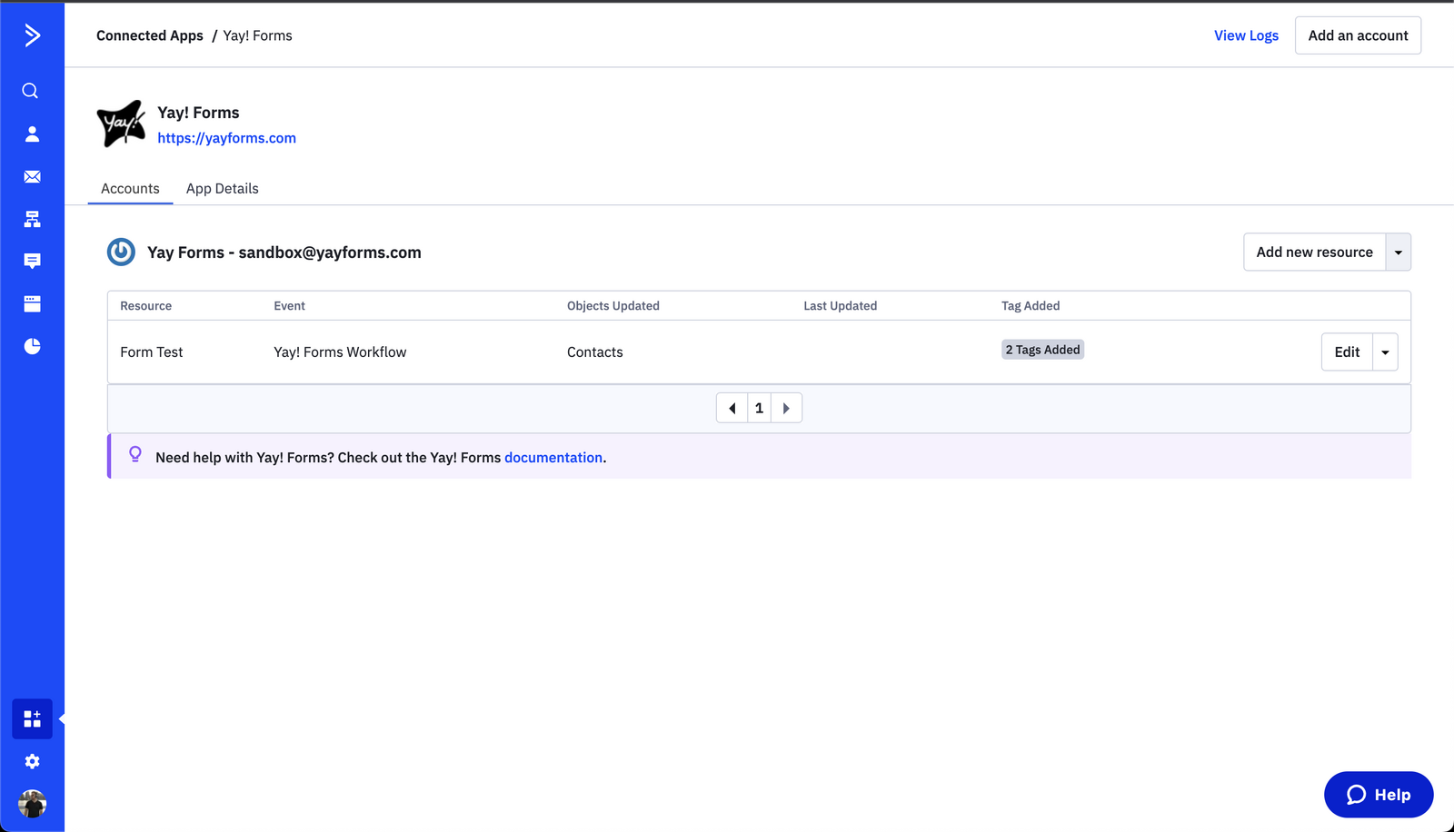 If you need to disconnect the account, integrate new forms, or view logs of submitted forms, just access it as indicated in the image below.
