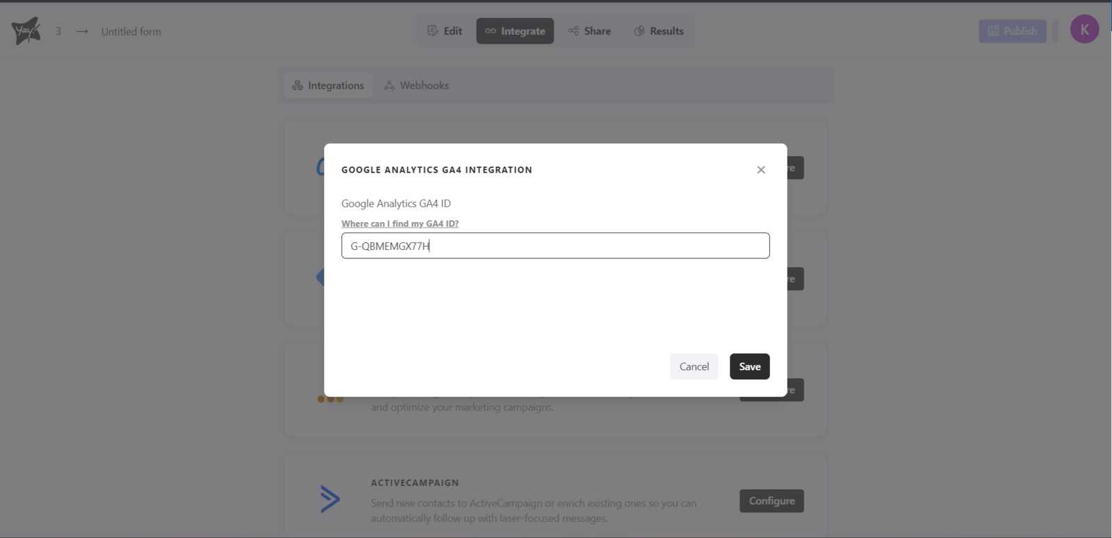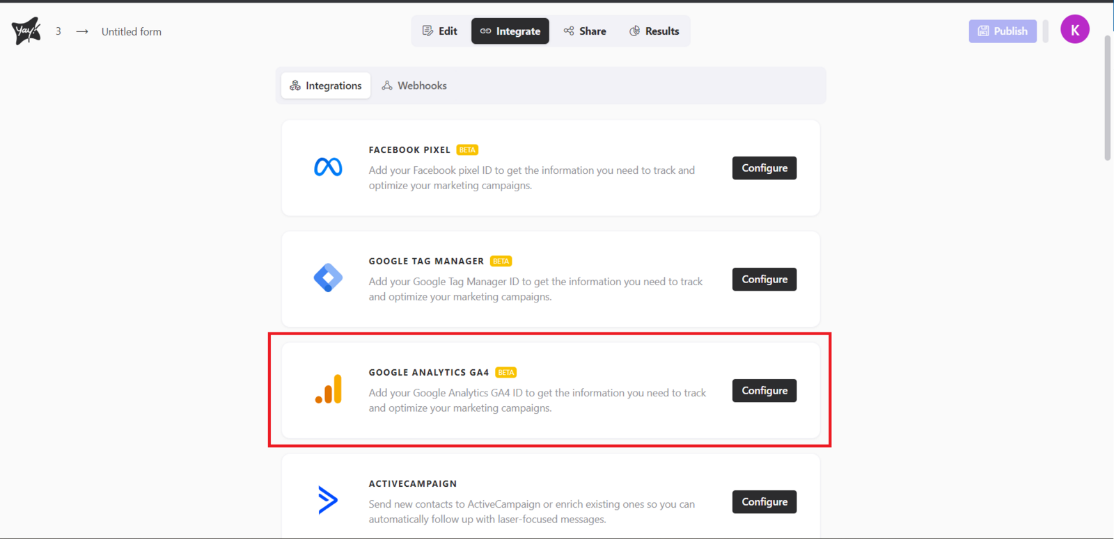 First, open the desired form and select the Integrate tab. At this point, you will find the Google Analytics option. Click Configure to proceed with setting up Google Analytics.