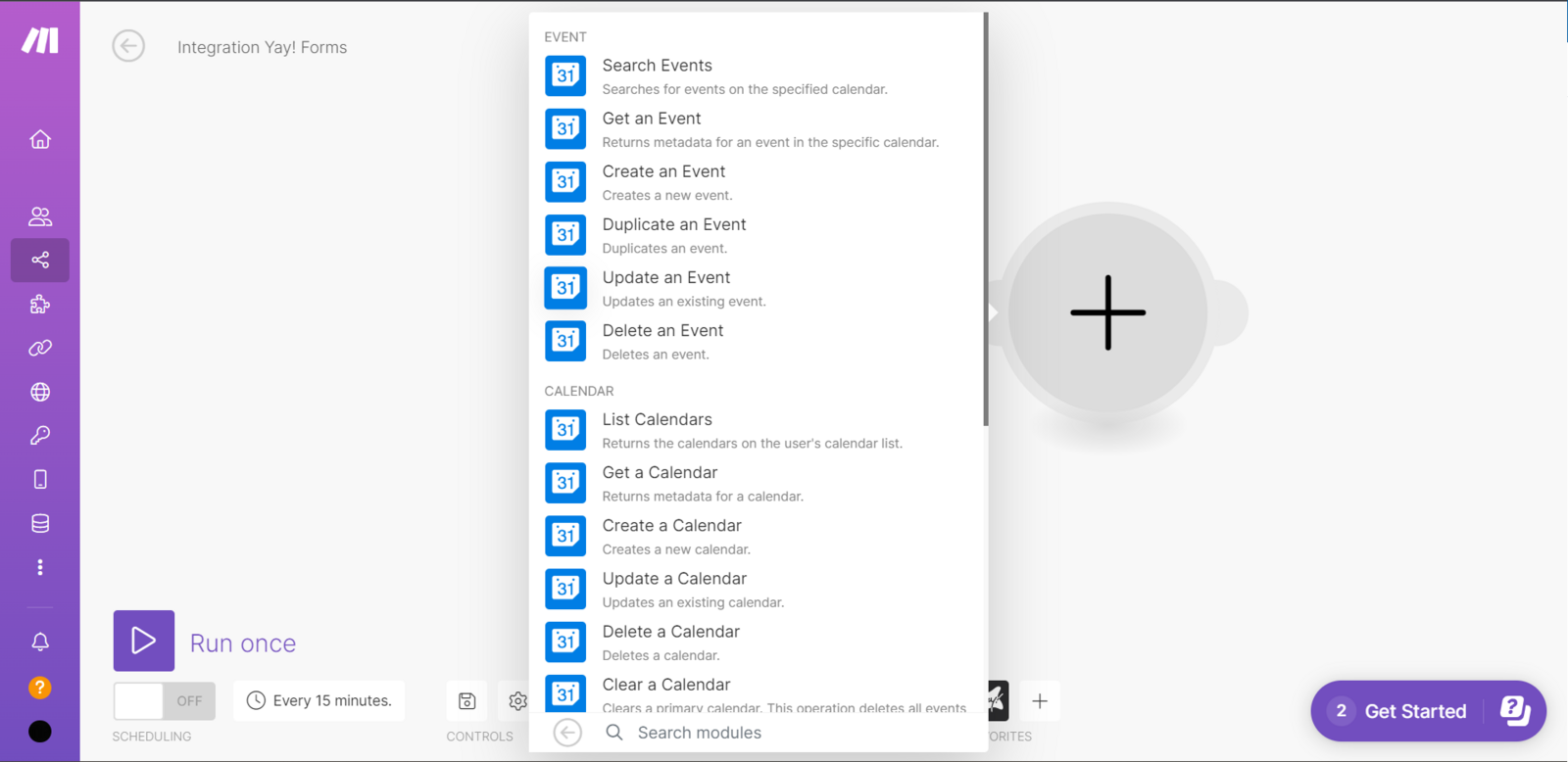 After setting up Yay! Forms, you will need to set up Google Calendar. To do this, click the button as shown below and search for Google Calendar. Then, you will need to choose the setup you prefer.