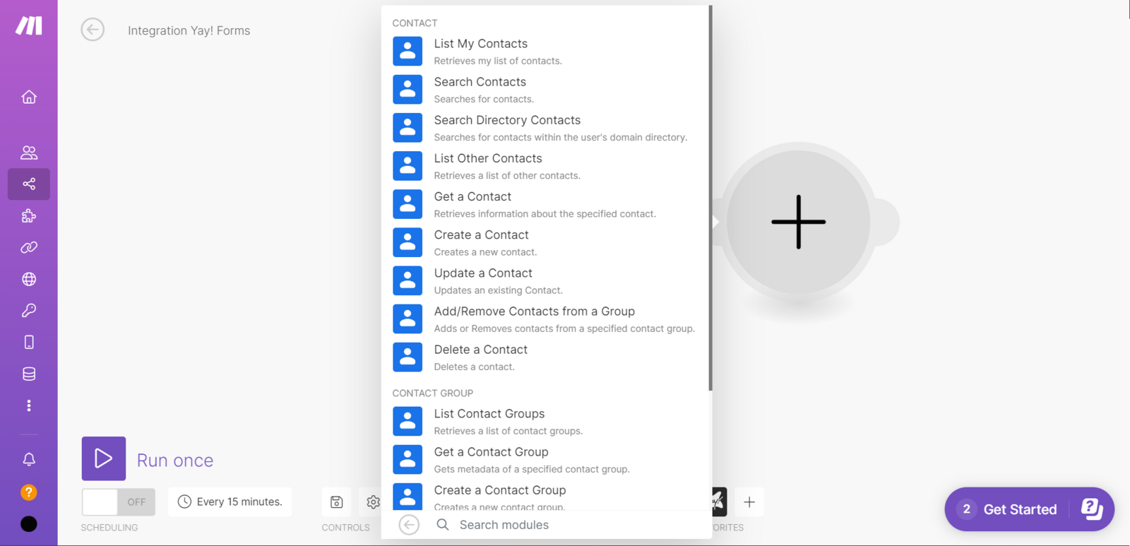 After setting up Yay! Forms, you must set up Google Contacts. To do this, click the button as shown below and search for Google Contacts. Then, you will have to choose the configuration you prefer.