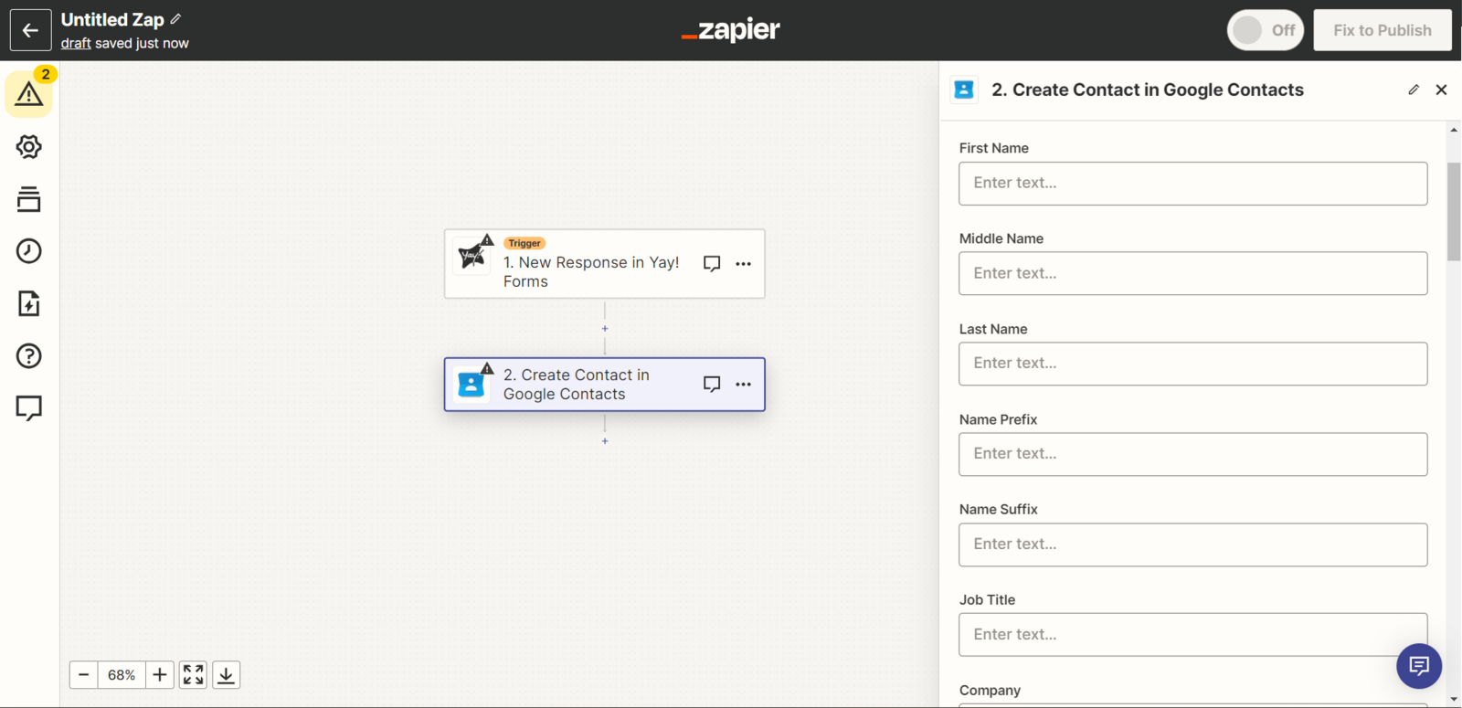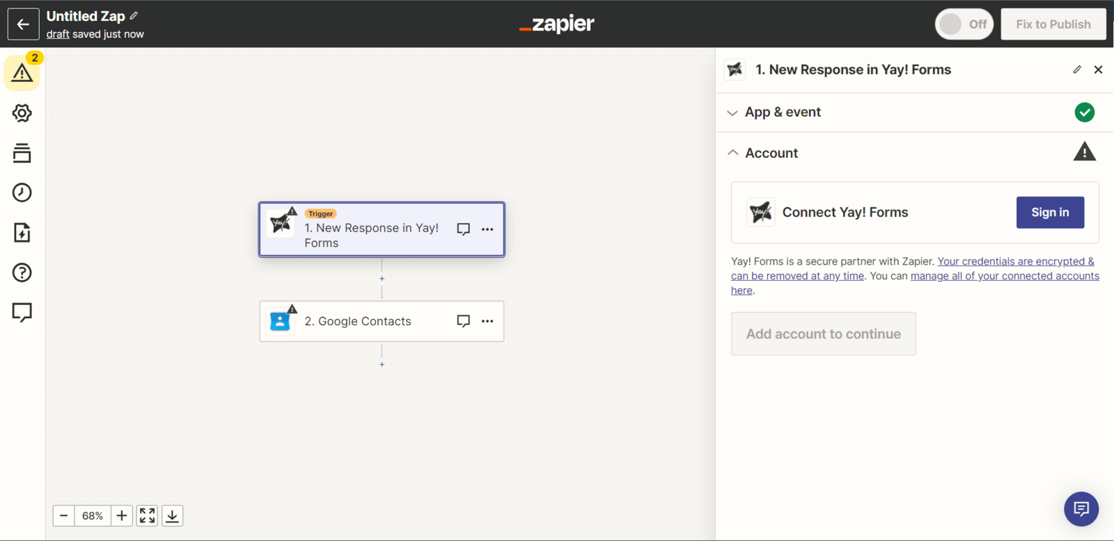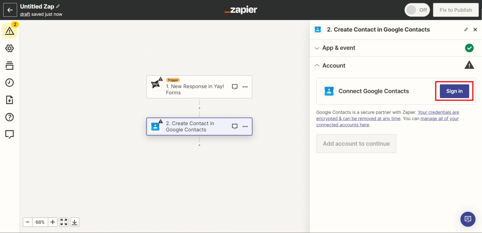You now know where to enable the Google Contacts integration in Yay! Forms, how to open and configure it through Zapier, and how to connect and authorize your Google Contacts account to complete the setup.