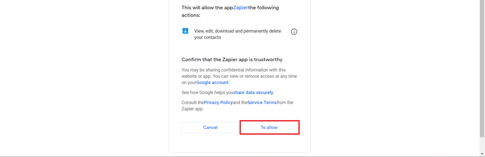 Right after you click, a window will appear for you to connect your Google Contacts account. Just connect and click Allow.