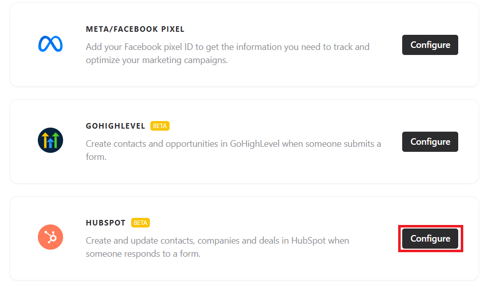 Open the desired form and go to the Integrate tab. There, you will find the integration with HubSpot. Click Configure to start setting up your HubSpot account.