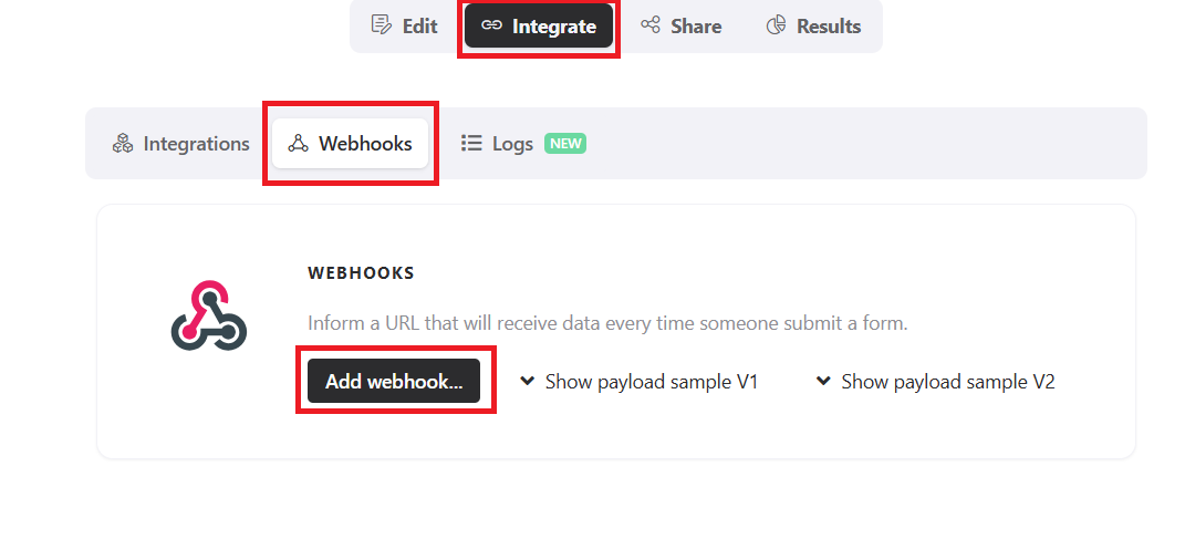 Next, go to Yay Forms, choose your form, and click Integrate, Webhooks and Add Webhook as shown below**.**