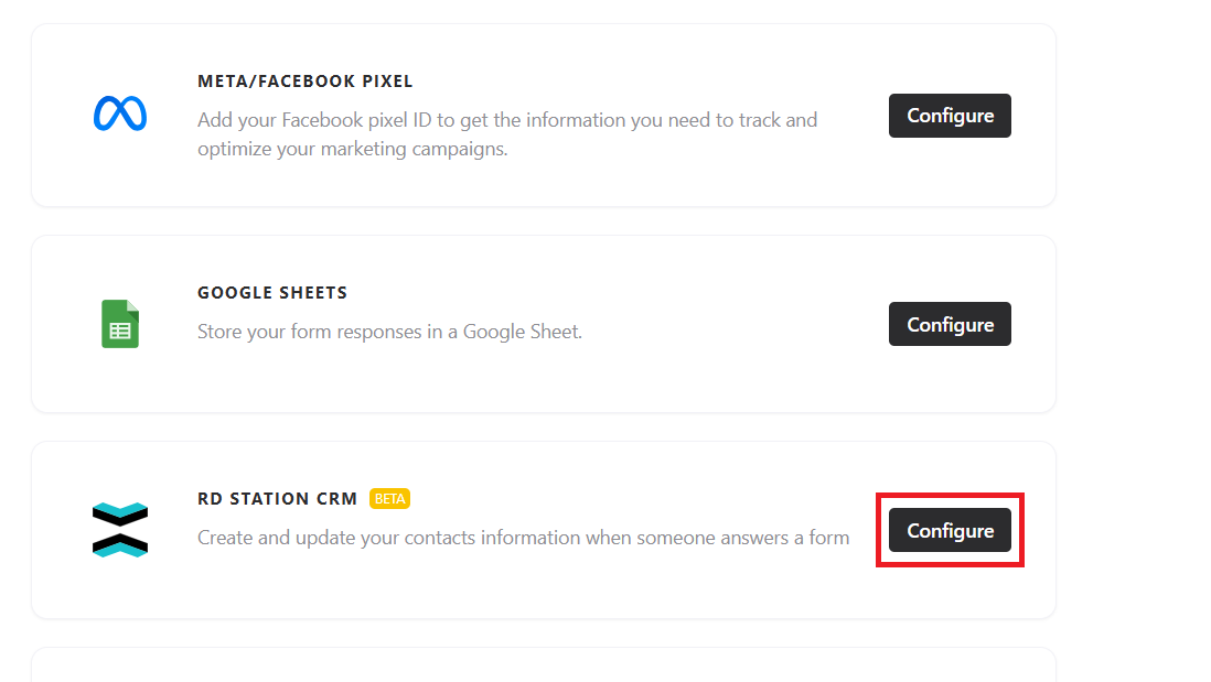 Open the desired form and go to the Integrate tab. There, you will find the Rd Station CRM integration. Click Configure to start setting up your Rd Station CRM account.