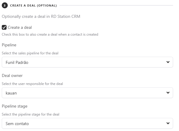 You can also map your form fields to your deal fields in Rd Station CRM. To do this, you first need to select a sales pipeline, a deal owner, and which stage of the pipeline the deal will be placed in.