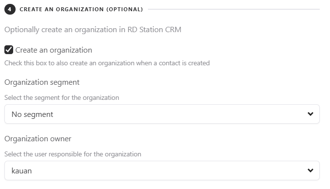 You can also map your form fields to the fields of the company created in Rd Station CRM. To do this, you first need to select the company segment (if you leave it blank, it will have no segment), and you must select a company owner.