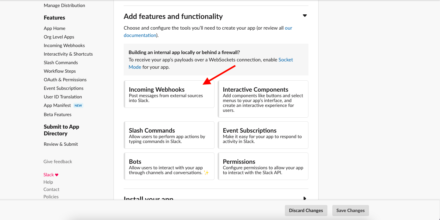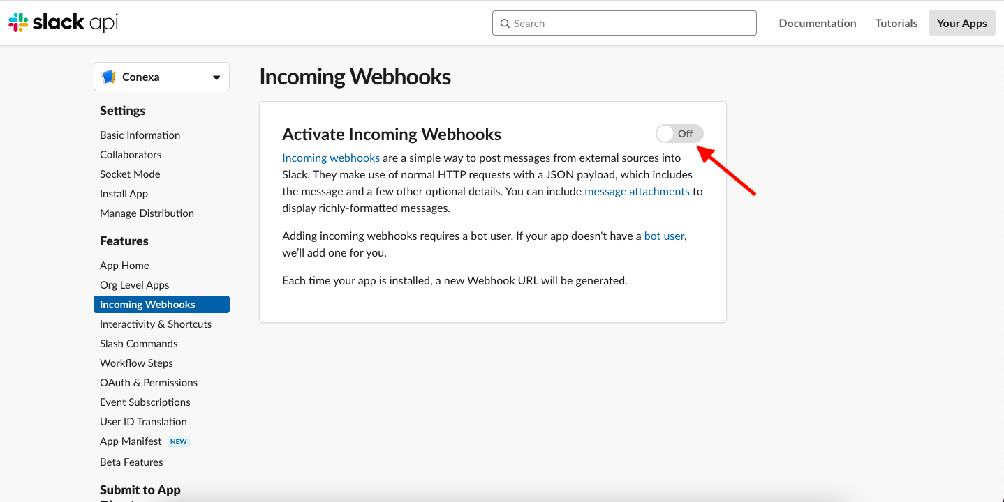Next, you will be redirected to the screen below, where the next step is to enable the Webhooks feature. Click Incoming Webhooks.