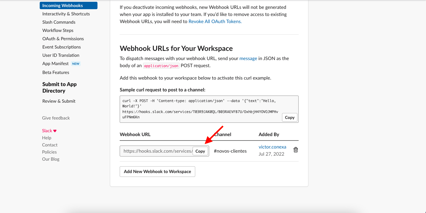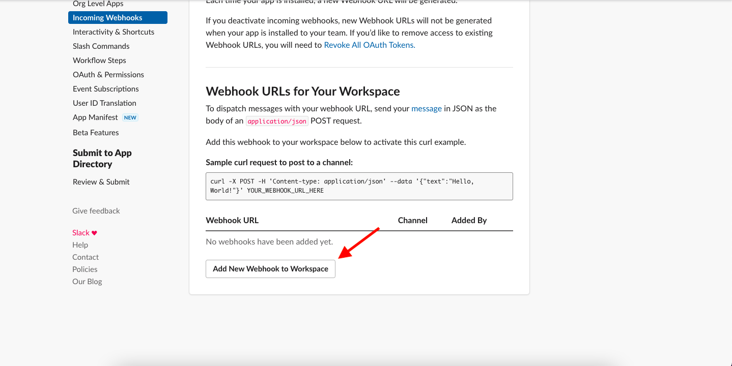 After enabling the Webhook feature, scroll to the bottom of the page and click the Add New Webhook to Workspace button, as shown in the image.