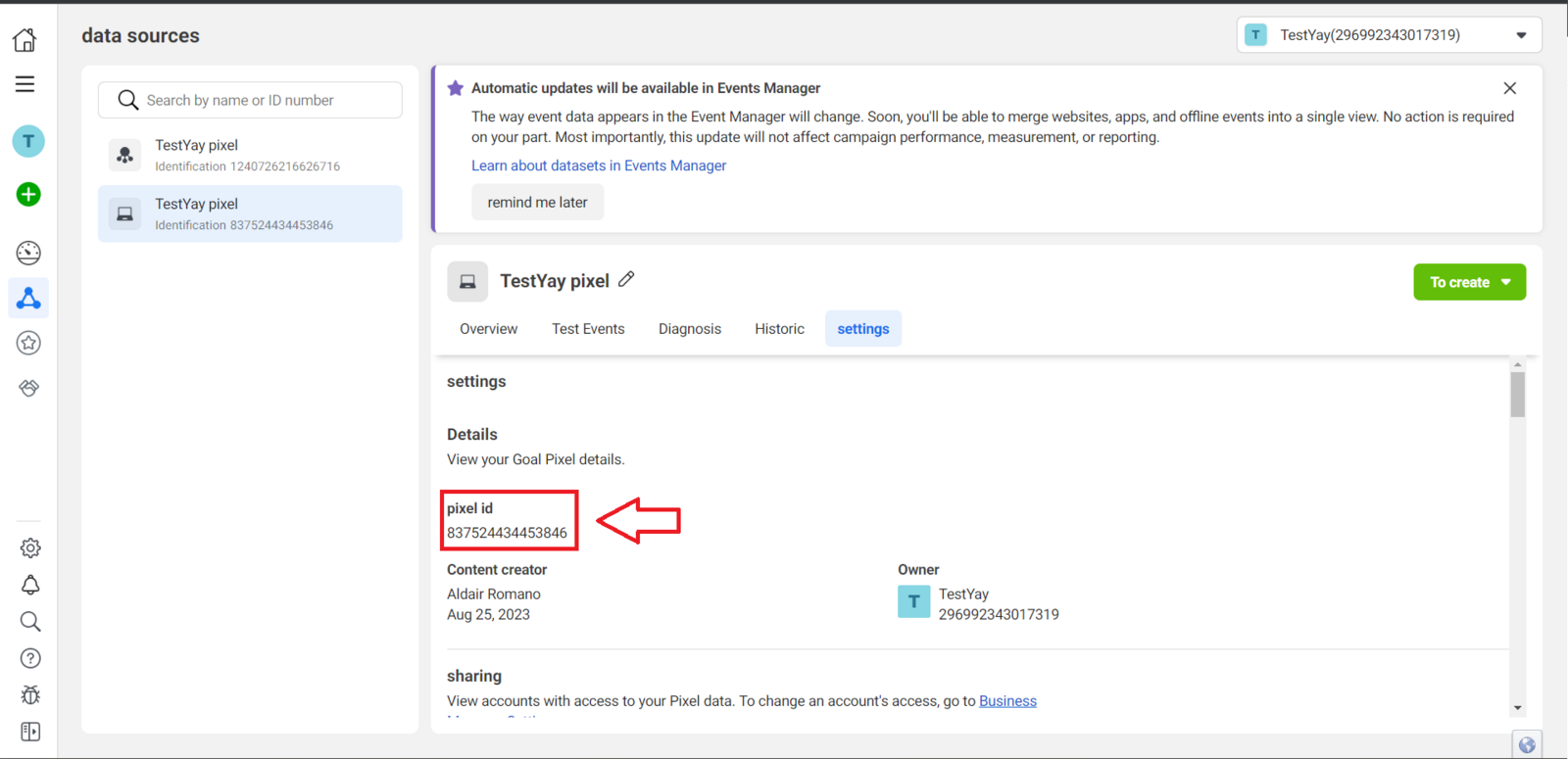 Now, you need to obtain the Pixel name, the Pixel ID, and the corresponding access token. To do this, access Facebook’s Events Manager. Then, select the desired Pixel and copy the required data, as shown in the images below.