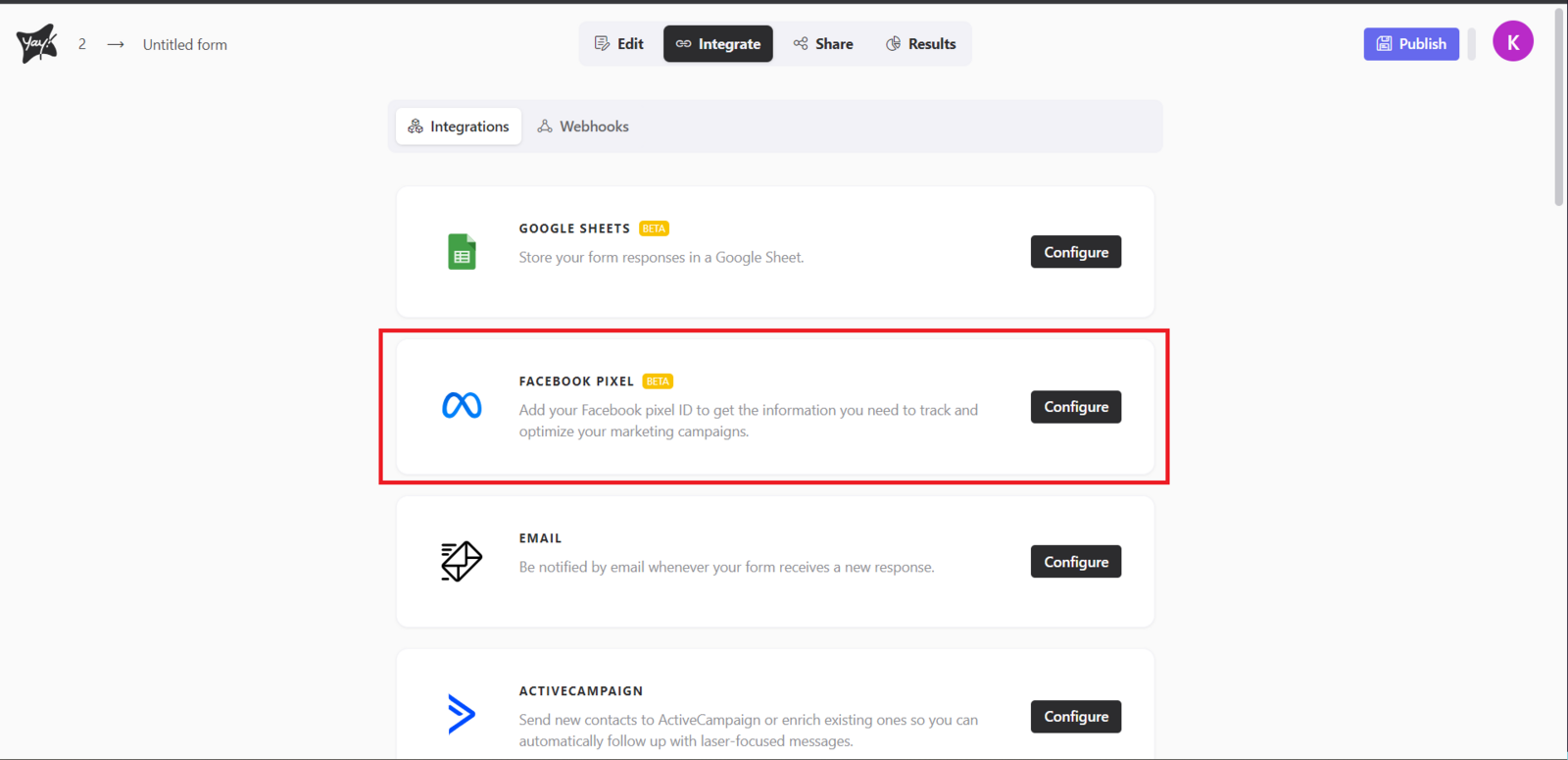 Access the desired form and select the Integrate tab. In this section, you will find the option related to the Facebook Pixel. Click Configure to proceed with setting up your Pixel.