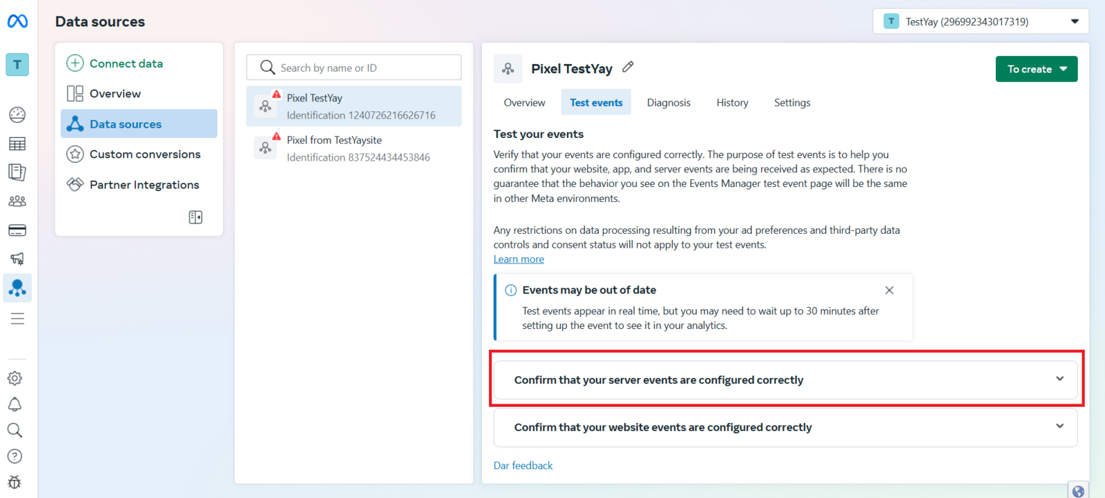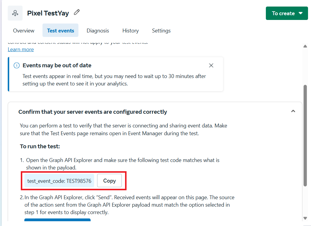 If you want to test the integration in real time, access Events Manager and go to the Test events tab. Then click Confirm your server events are set up correctly, as shown in the image below: