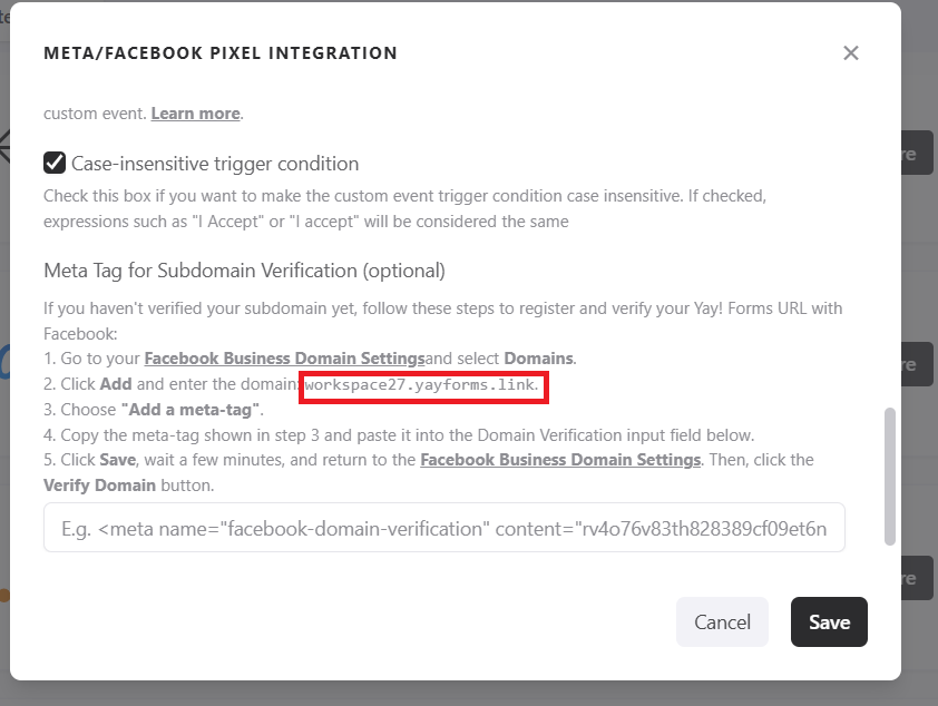 Add the domain you copied earlier from Yay! Forms: