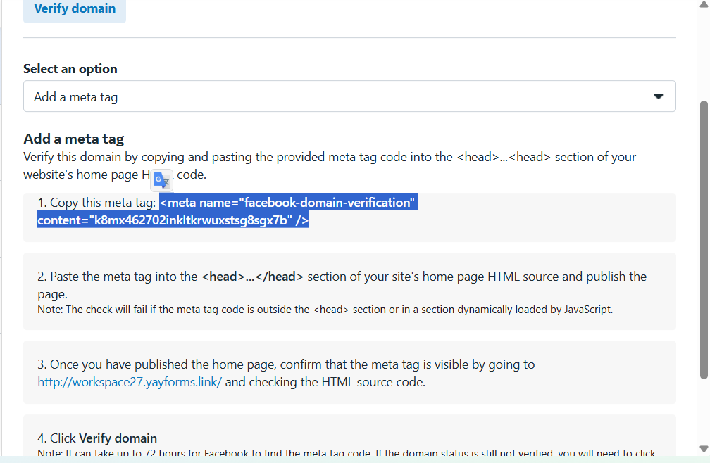 Copy the domain meta tag, as shown below: