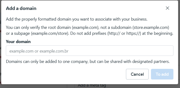 Then create a new domain in Facebook Business Manager: