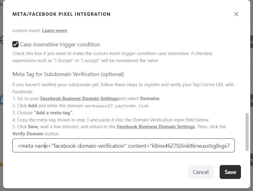 This guide details the process of native integration between Yay! Forms and Meta Ads (Facebook Ads), using Meta’s Conversion API to send events automatically and reliably. It will help you connect your Meta Pixel, validate event delivery, understand which events are sent by default, and configure optional enhancements such as custom events, domain verification, advanced matching, and incomplete form event sending.
