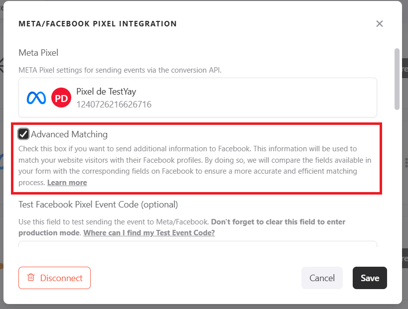 You can check the option "Advanced matching", allowing our AI to collect compatible data from the response, such as name, email, age, gender, location, etc., and send this information to Facebook to increase the event score.