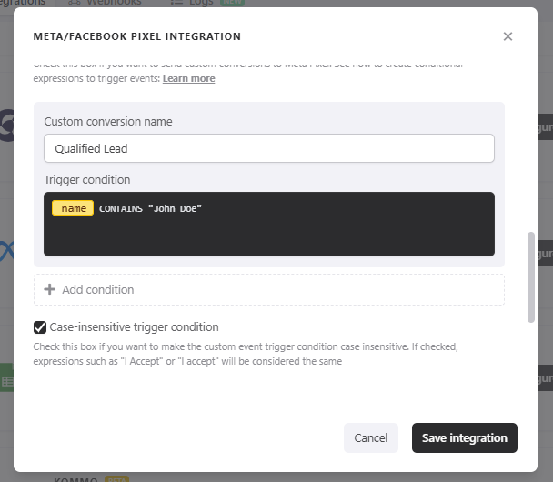 **Multiple custom events: **You can have multiple custom events—just click the "Add condition" option so you can send more custom events with different conditions.
