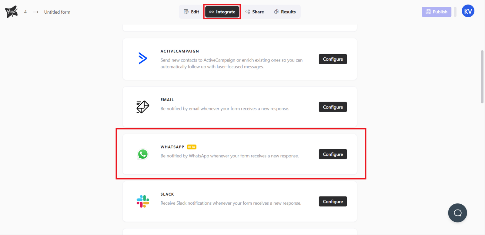 First, access the desired form and select the Integrate tab. Just scroll down and you will find the option related to WhatsApp. Now, click configure, as shown in the image below: