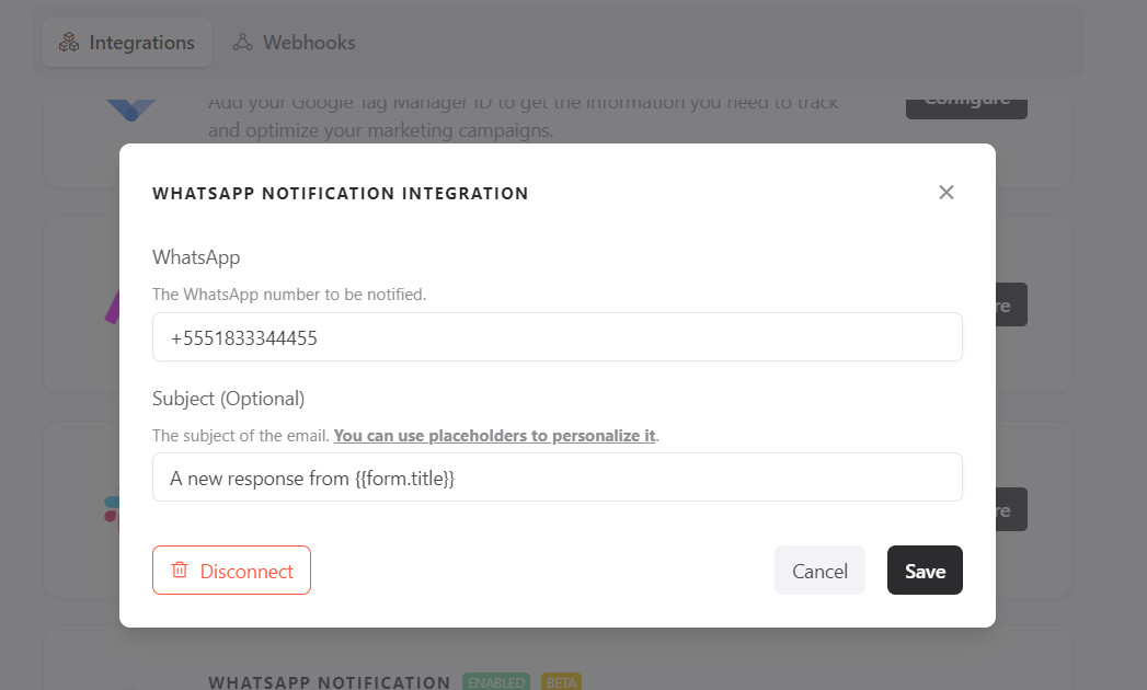 Now, just enter the phone number where you want to receive notifications related to your form, and if you want to send a message along with the responses, just fill in the second field.