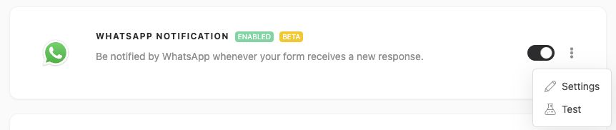 After setting up your integration, you can easily enable or disable it by clicking the button below. In addition, you can adjust the settings or test it by clicking the three dots.