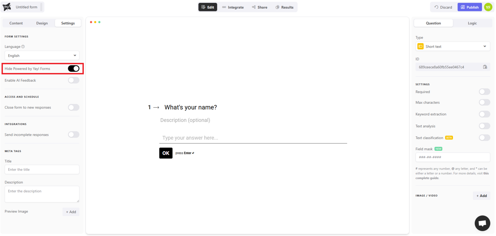 This article will help you understand how the Yay Forms watermark (“Made with Yay Forms”) works by default and how to remove it from your forms using the form settings.