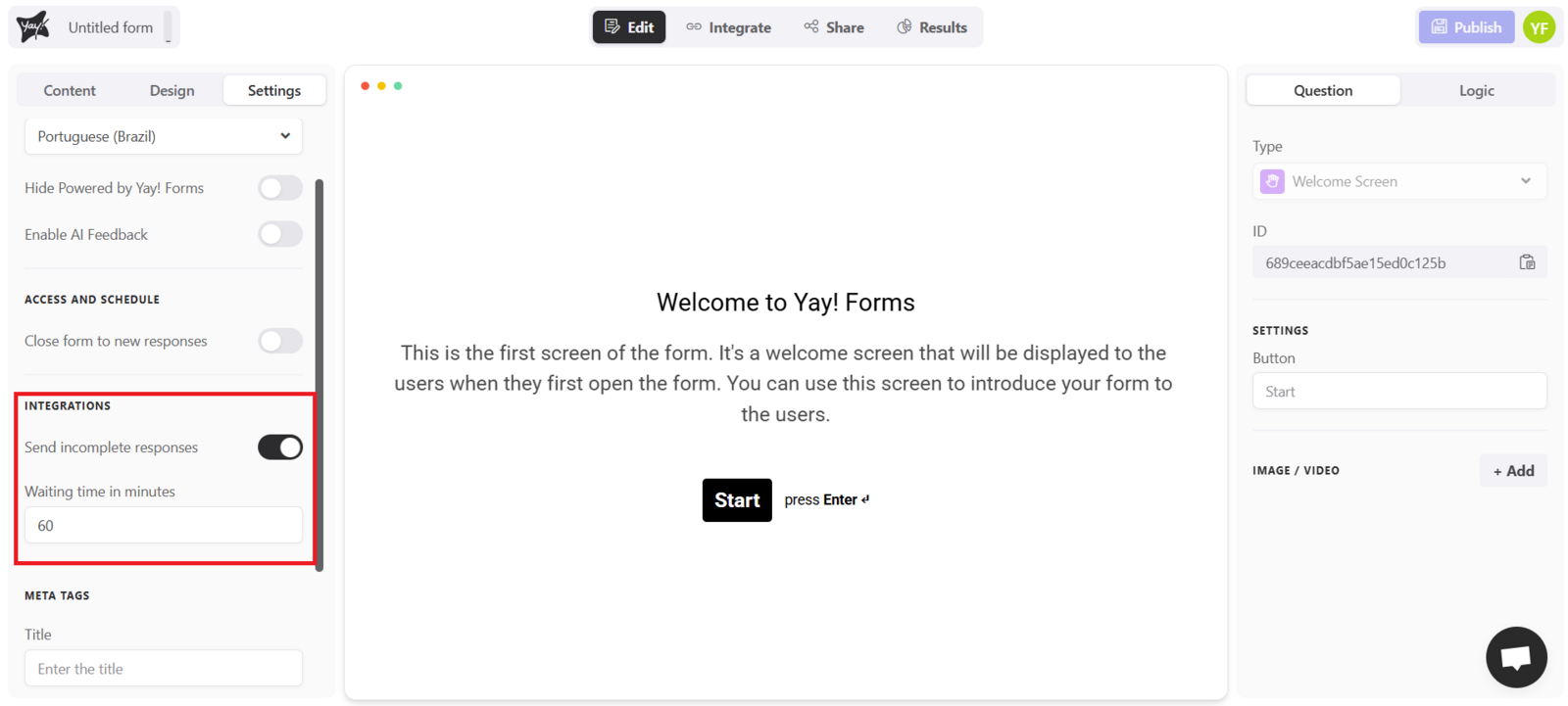 By enabling Send incomplete responses and setting a wait time in minutes, you ensure your integrations can still receive the data a user entered even if they do not finish submitting the form within the time you define.