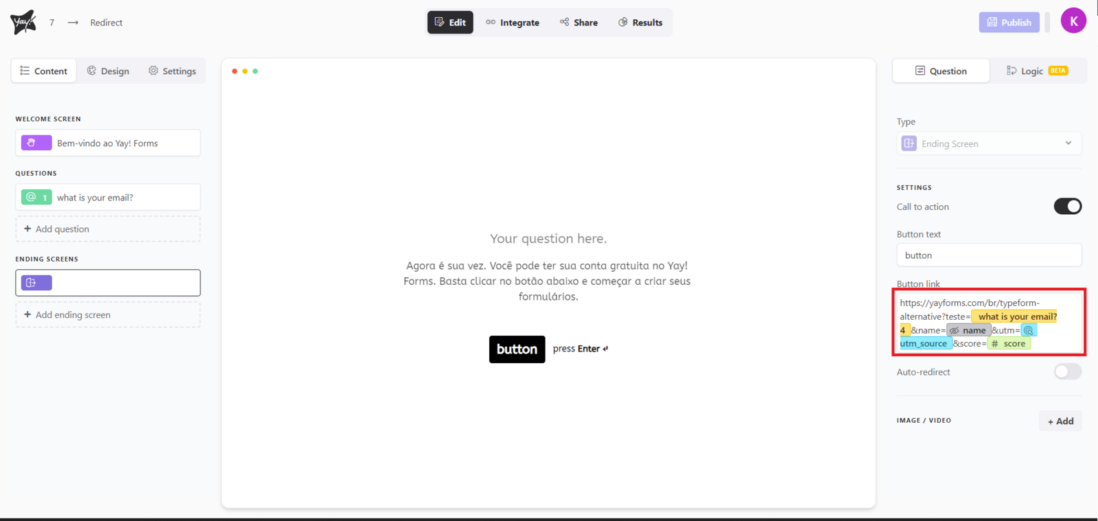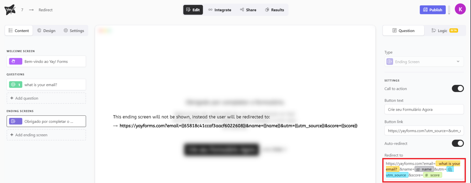 To use mentions on the final screen when you want to automatically redirect, use the values as parameters in the desired URL, as shown in the examples below: