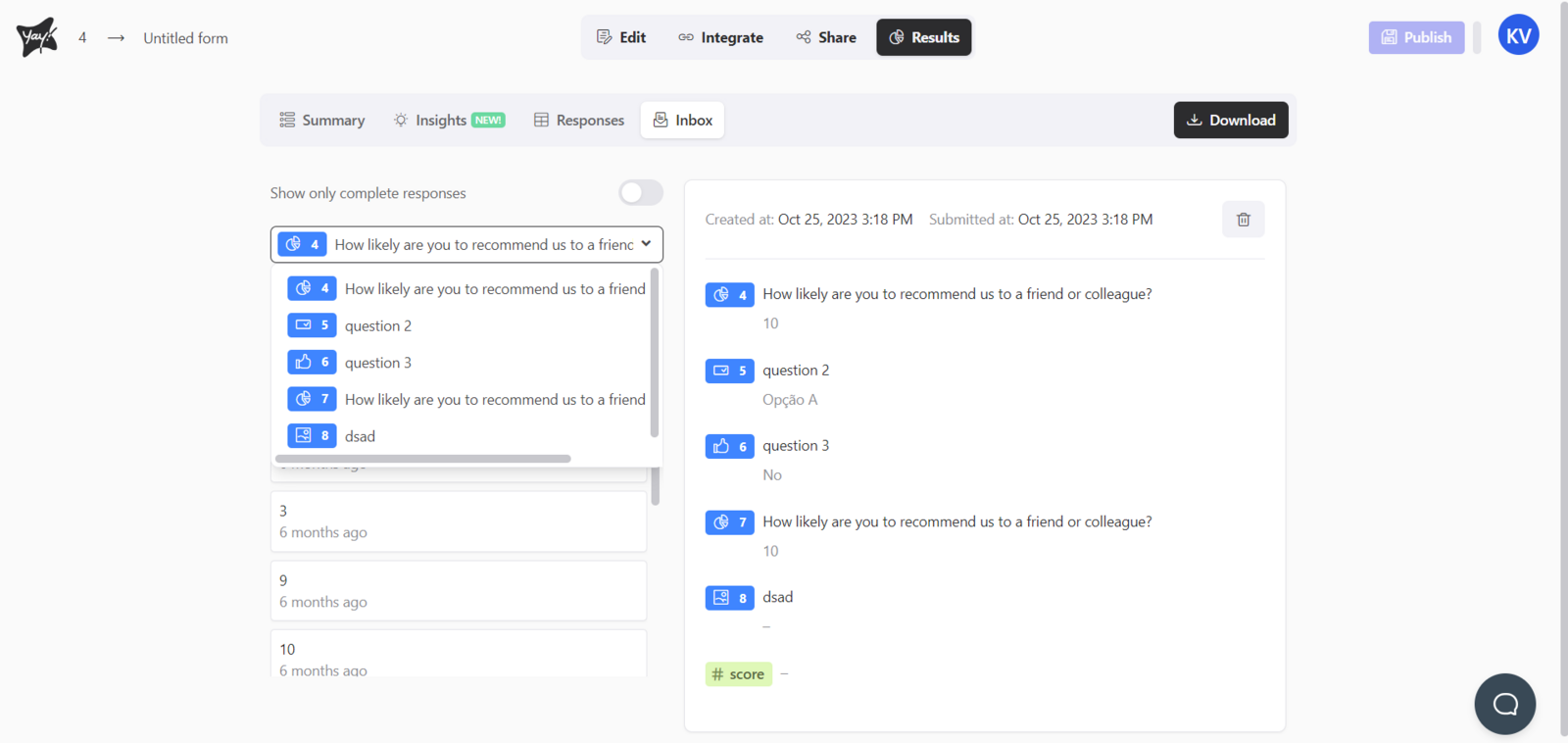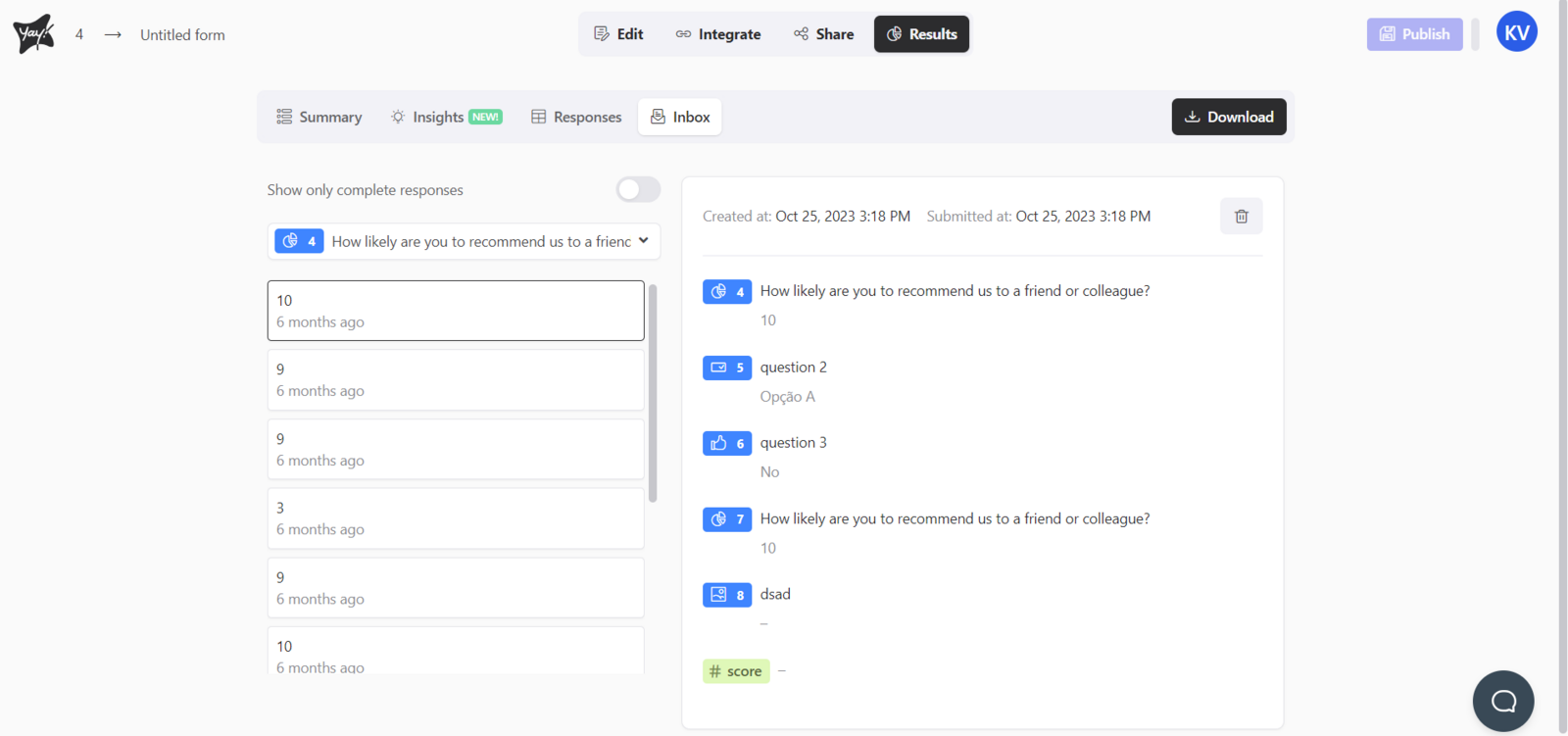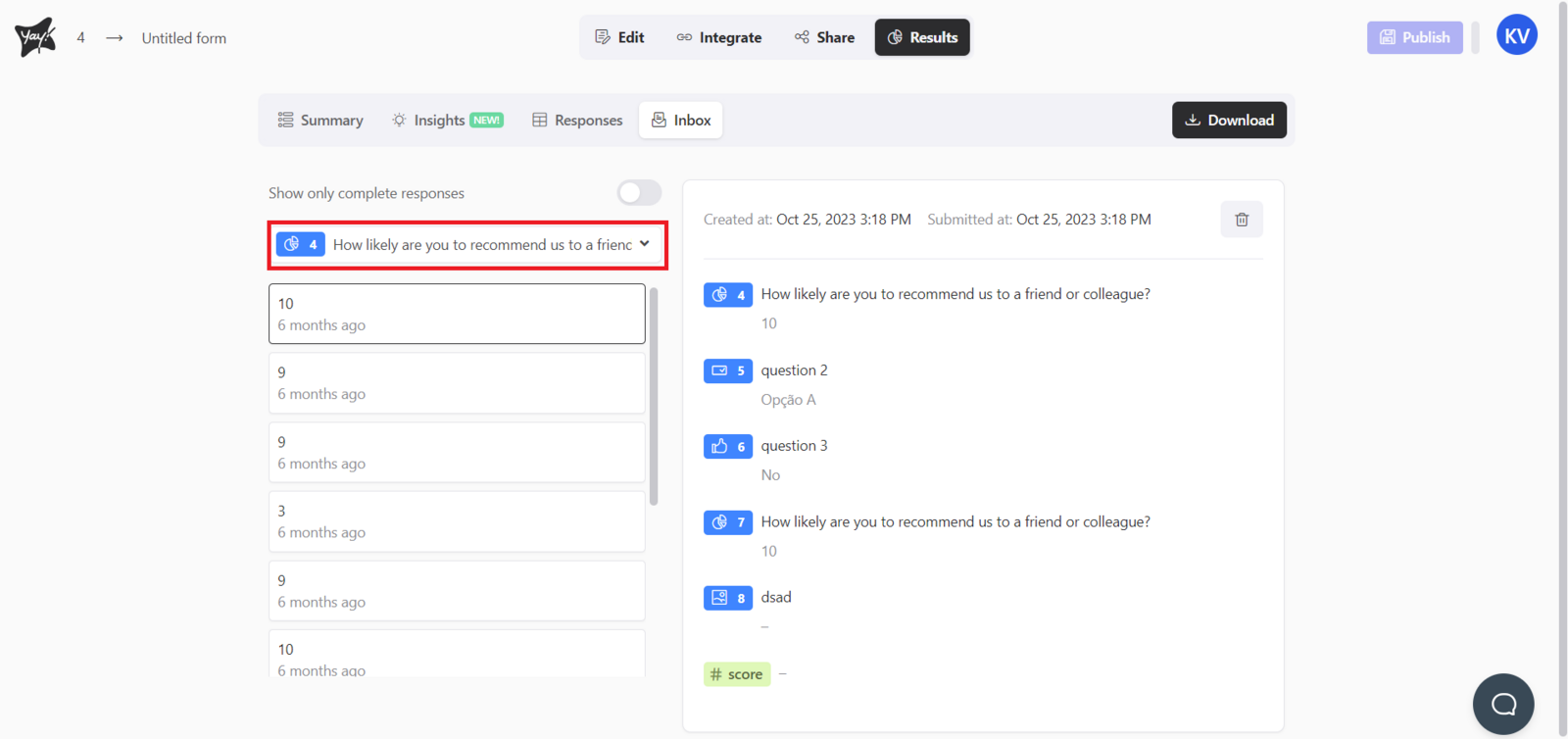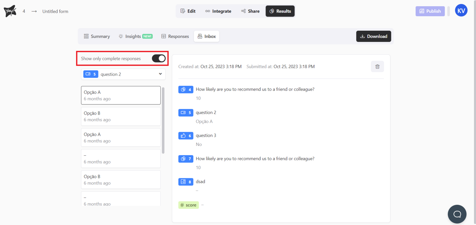 You learned how to open the inbox from your form results, navigate and filter responses, download a selected submission, focus on complete responses only, and remove responses from the inbox.