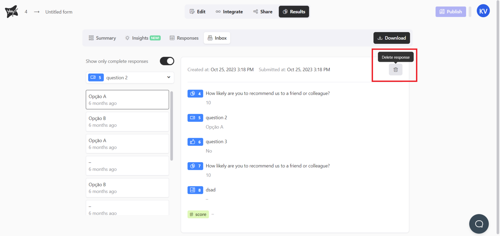 You can also delete a response by clicking the Delete response button in the upper-right corner of the selected response, as shown in the image below: