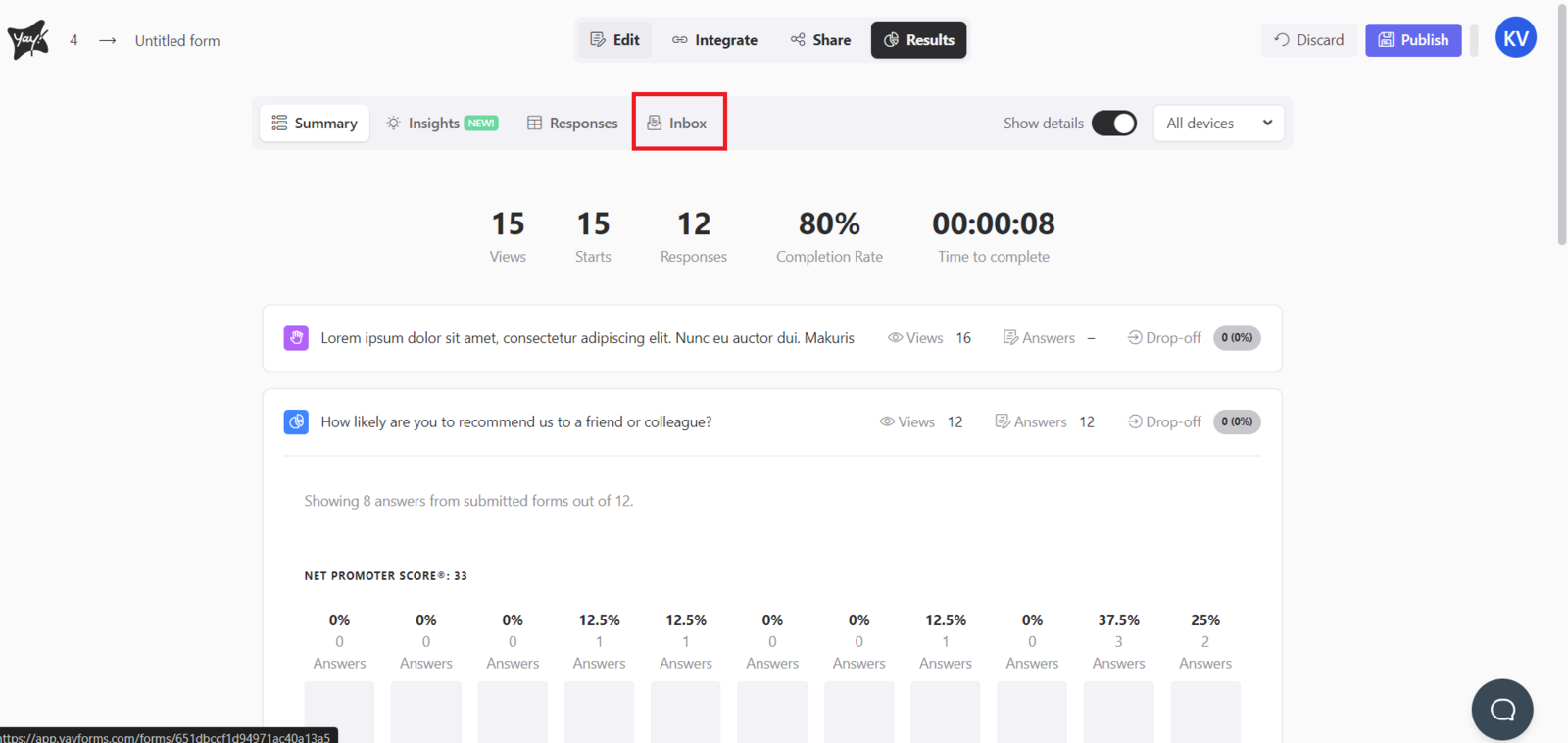 First, to access your inbox and check your responses, simply take a look at the results page of your form and click the Inbox section, as shown in the image below: