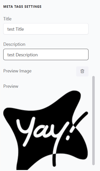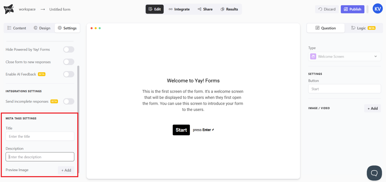 Para personalizar as Meta Tags do seu formulário, basta acessar a parte de Configurações. Lá, você poderá ajustar o Título, a Descrição e a Imagem de preview, conforme mostrado abaixo.