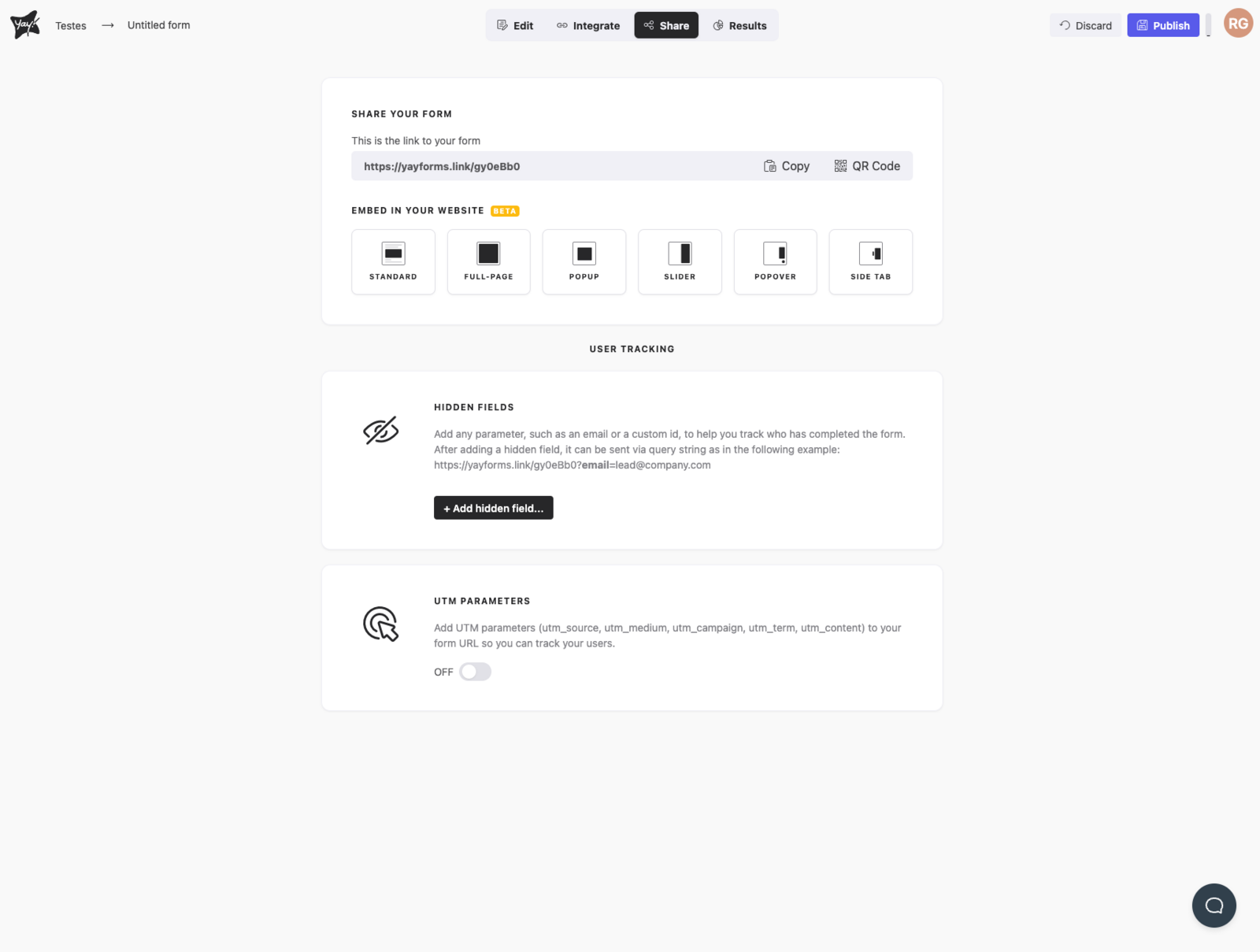 Agora você sabe onde encontrar as opções de compartilhamento do Yay Forms, quais tipos de embed estão disponíveis e como obter o código para incorporar seu formulário no HTML da sua página.